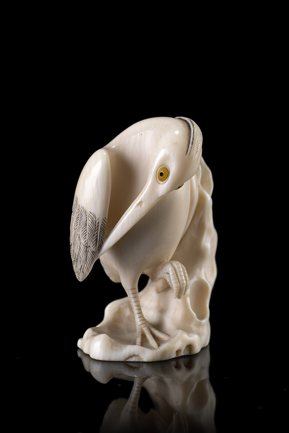 Netsuke in avorio raffigurante una gru su rocce Giappone, sec. XIX Provenienza: collezione privata milanese. An ivory netsuke of a crane on rocks Japan, 19th century Provenance: a Milanese private collection. (h. 4 cm.)