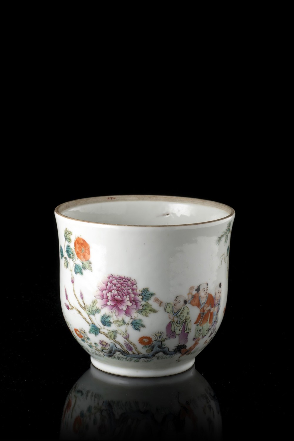 Jardiniere in porcellana con smalti Famiglia Rosa con decorazione di galli e bambini in gioco Cina, con marchio Guangxu e del periodo (1875-1908) A porcelain Famille Rose jardiniere depicting cockerels and children at play China, Guangxu mark and of the period (1875-1908) (h. max. 9,5 cm.)