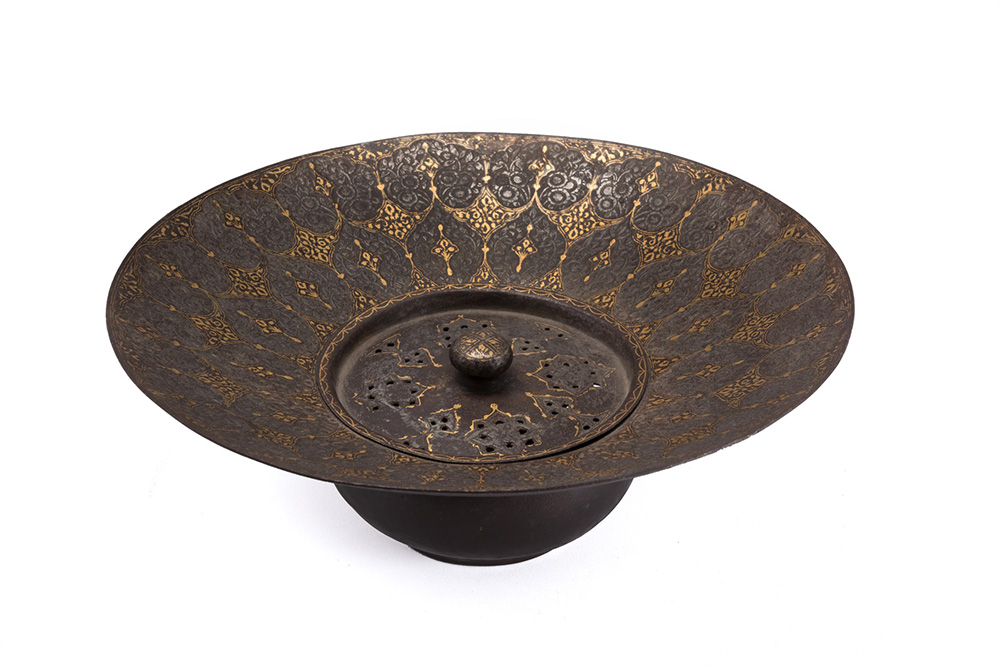 Porta incenso a forma di catino in ferro cesellato a fiori e ageminato in oro a fregi orientali. Coperchio traforato con presa sferica Area persiana A pierced iron incense burner and cover decorated with flowers and gilt floral motifs Persian area (diam. 30 cm.)