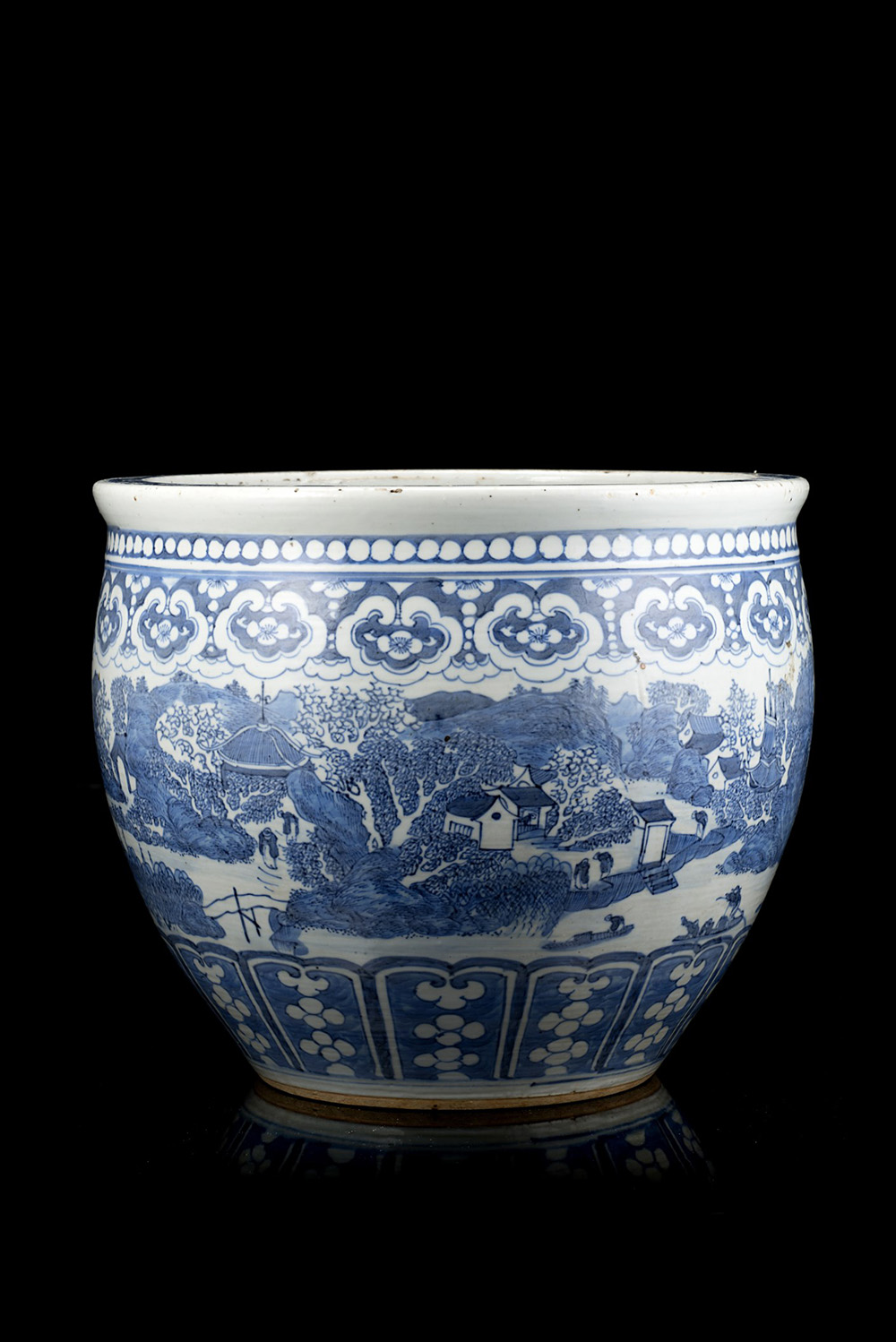 Jardiniere in porcellana bianca e blu, decorata con scena continua di figure in un paesaggio bordata con motivi geometrici, base in legno (lievi difetti) Cina, sec. XX A blue and white jardiniere painted with a continuous landscape scene within two decorative borders, wood stand (minor losses) China, 20th century (25x30 cm.)