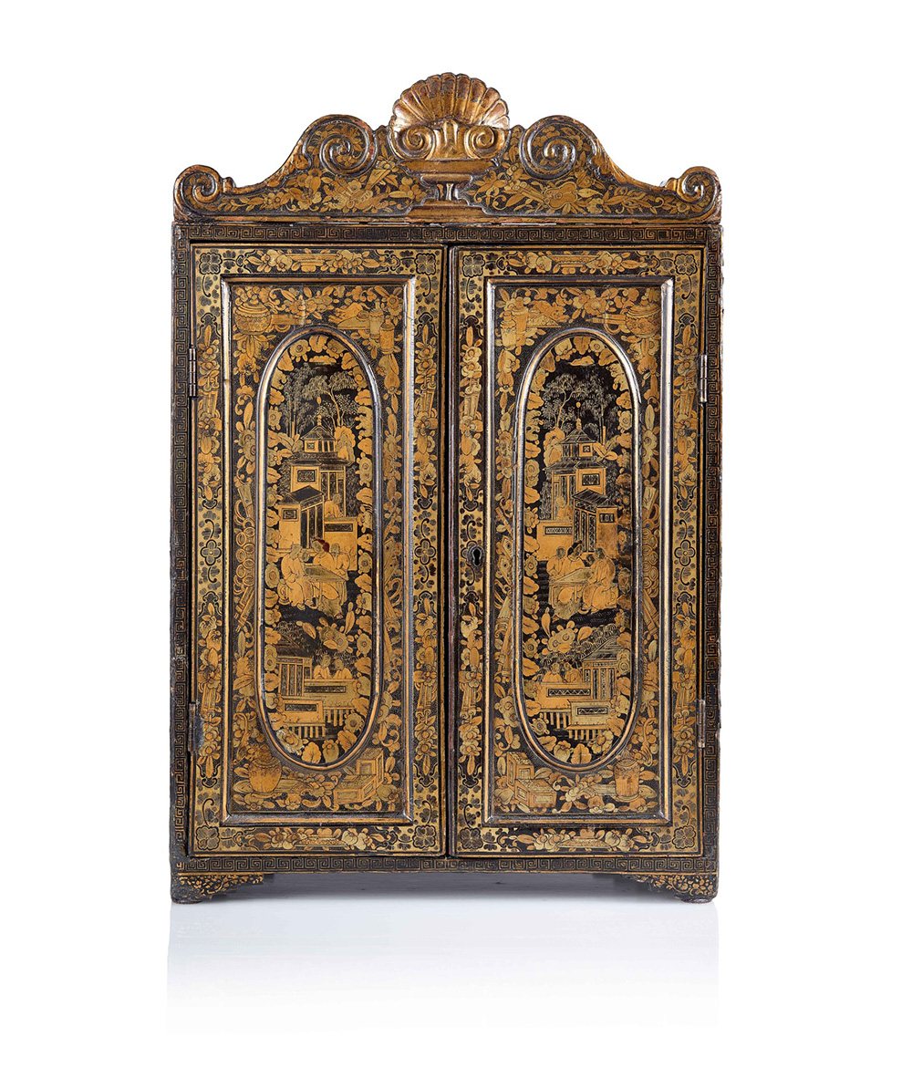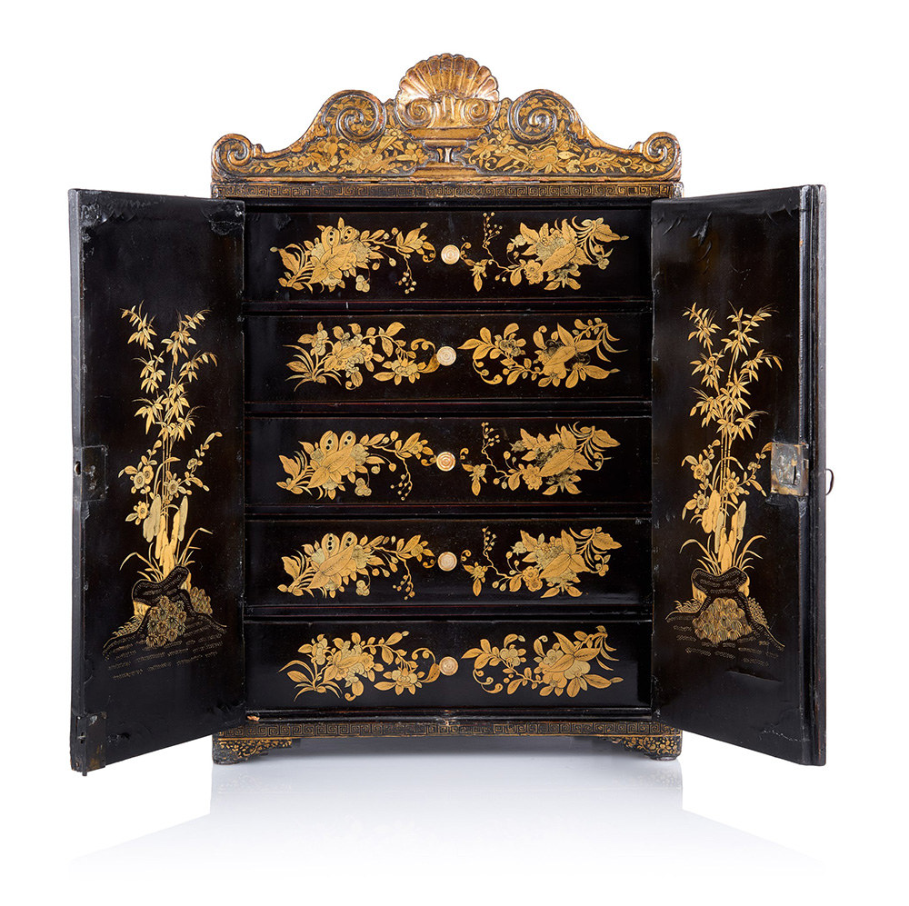 Mobiletto a due ante laccato in nero e oro con decorazioni floreali e di paesaggio, all'interno con cinque cassetti e chiave annessa (difetti e restauri) Cina, sec. XIX A two-doors black and gilt lacquered table cabinet decorated with figures in landscapes and floral motifs, the interior with five drawers, with key (losses and restorations) China, 19th century (57x38x19 cm.)