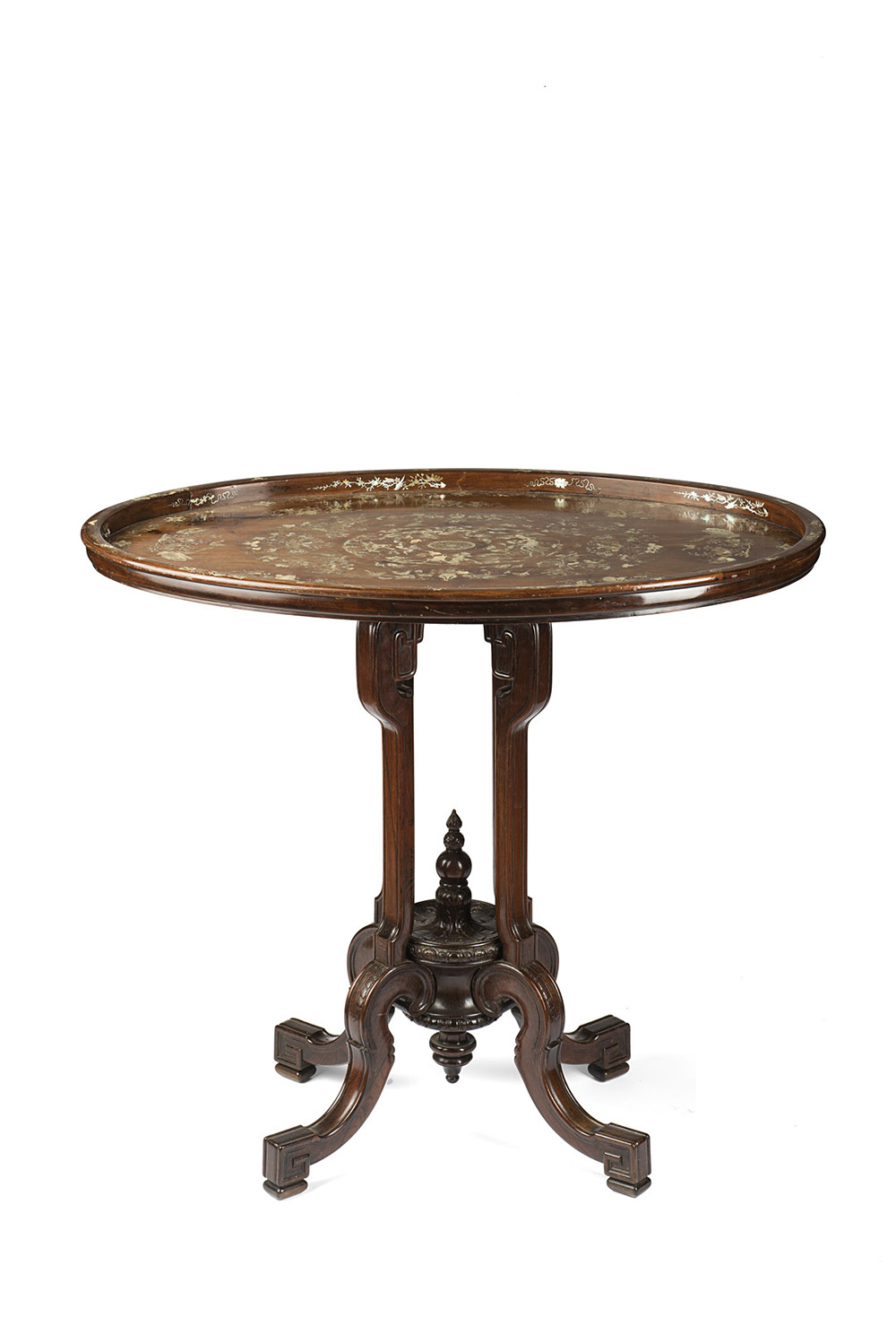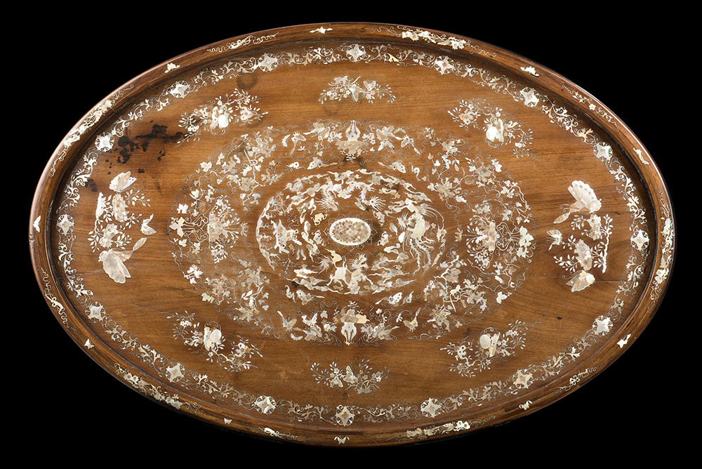 Tavolino ovale con piano in legno di frutto intarsiato in madreperla a farfalle, fiori e uccelli. Base in noce d'India, gambe sagomate e intagliate decorate da pinnacolo tornito Cina, inizio sec. XX An oval coffee table, inset with mother-of-pearl decoration of flowers, butterflies and birds, the timber of Indain walnut wood China, 20th century (87x76x58 cm.)