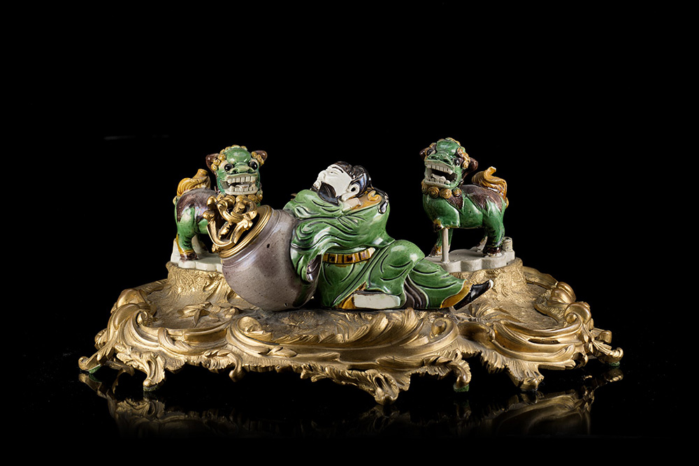 Li Bai con due piccoli leoni buddhisti in porcellana a "treÅÅ colori", su base in bronzo dorato francese (lievi difetti) La porcellana, Cina, epoca Kangxi (1662-1722) A model of Li Bai and two small Buddhist lion glazed in three colours, on an ormolu base (minor losses). The porcelain, China, Kangxi period (1662-1722) (l. 36 cm.)