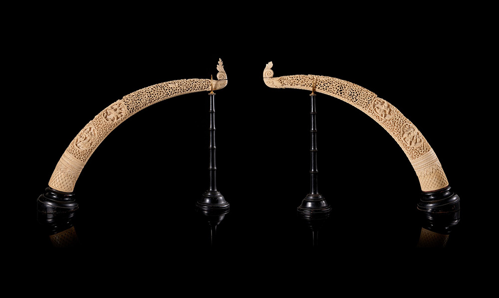 Coppia di zanne in avorio, riccamente intagliate e cesellate con figure e divinit‡, con supporti e basi in legno e bronzo dorato (lievi difetti) Area indiana, fine sec. XIX A pair of ivory tusks, each richly carved and pierced with figures and deities, with bases and supports in wood and gilt bronze (minor losses) Indian area, late 19th century (h. max. 80 cm.)