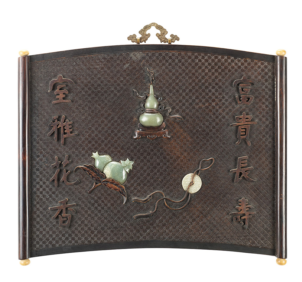Placca in legno con decorazione intagliata, particolari in giada e pietra dura, con iscrizione calligrafica Cina, sec. XIX A carved wood plaque with inset-jade and hardstone decoration and calligraphy China, 19th century (48x40 cm.)