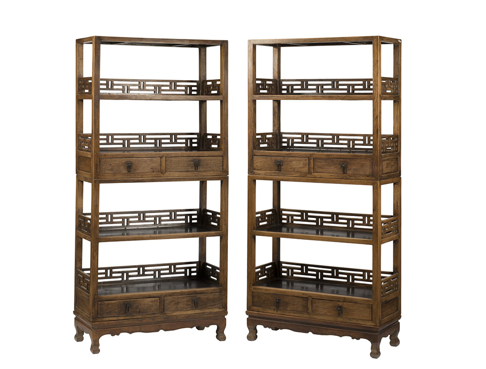 A pair of huanghuali wood book shelves, each composed in three tiers, with geomtric friezes