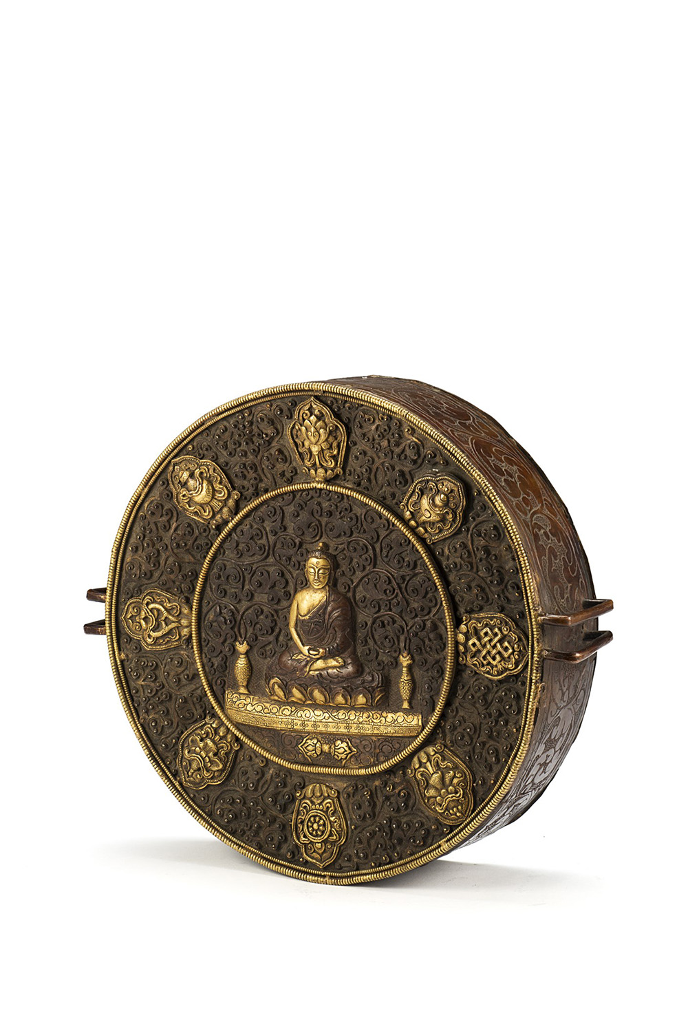 Porta reliquie di forma circolare in metallo lavorato e dorato decorato con Buddha al centro e gli otto simboli buddhista bajixiang Tibet, sec. XIX A gilt metal round box and cover decorated with a Buddha and the eight auspicious signs, baijixiang Tibet, 19th century (diam 23 cm.)