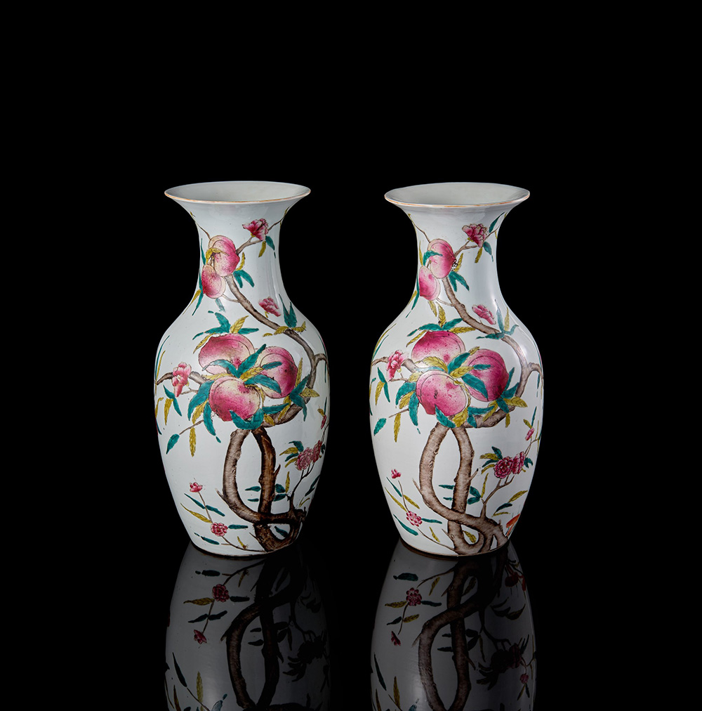 Coppia di vasi in porcellana Famiglia Rosa decorati con motivo delle nove pesche Cina, inizio sec. XX A pair of Famille Rose porcelain ënine peachesí vases China, early 20th century (h. 42,5 cm.)