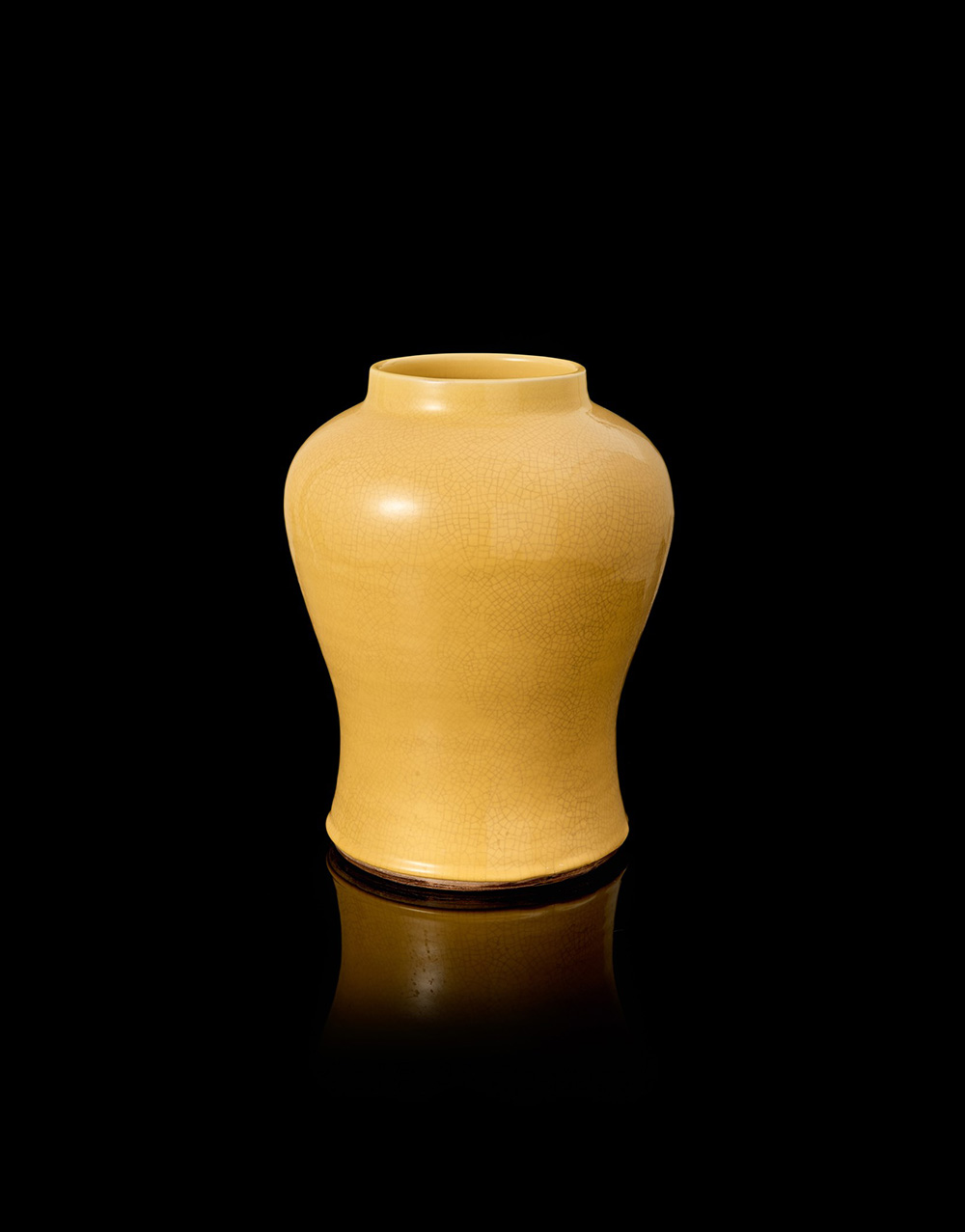 Vaso in porcellana a invetriatura gialla e craquele Cina, sec. XX A porcelain vase glazed in yellow with craquelure China, 20th century (h. 36 cm.)