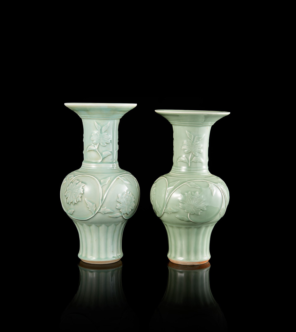 Due vasi in porcellana con invetriatura celadon e decorazione incisa a motivi floreali, uno con marchio sul fondo Cina, sec. XX Two celadon glazed vases with floral decoration in high relief, one with mark to the base China, 20th century (h. 38, 5 cm.; 41 cm.)