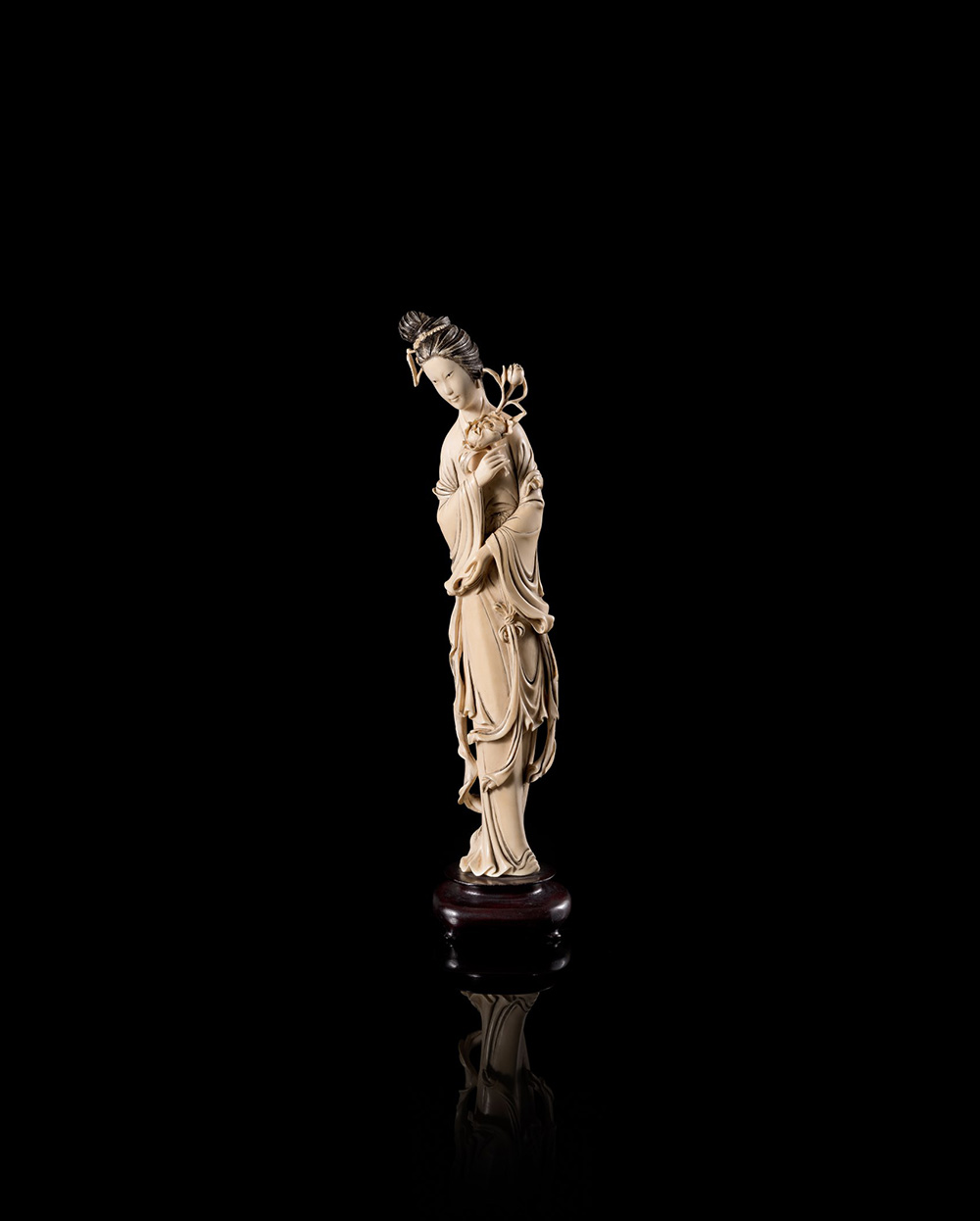 Scultura in avorio raffigurante dama dalle lunghe vesti con ramo di fiori, con base in legno Cina, inizio sec. XX An ivory carving of a lady wearing long robes and carrying flowers, with wood base China, early 20th century (h. 30 cm.)