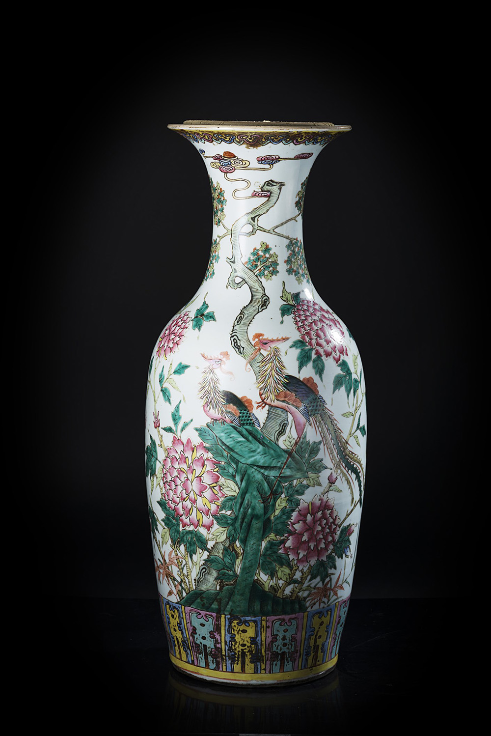 Vaso a balaustro in porcellana Famiglia Rosa decorato con coppia di fenici e fiori di peonia e con motivo ruyi Cina, sec. XIX A Famille Rose baluster vase, decorated with a pair of phoenix and peonies, a ruyi head border by the neck China, 19th century (h. 60 cm.)