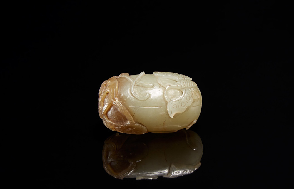 Snuff bottle in giada celadon e russet a forma di melone con farfalla (coperchio mancante) Cina, sec. XIX A melon-shaped celadon and russet jade snuff bottle with a butterfly (no stopper) China, 19th century (h. 6,5 cm.)
