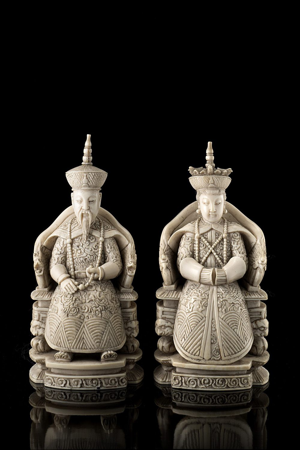 Lot 819 | Coppia di sculture in avorio raffiguranti imperatore e imperatrice assisi su...