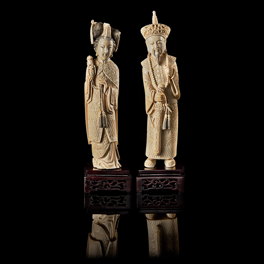Coppia di sculture in avorio raffigurante imperatore e imperatrice stanti,...