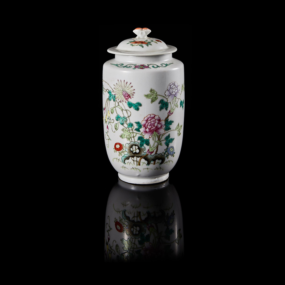 Vaso a lanterna con coperchio, delicatamente smaltato in Famiglia Rosa con...