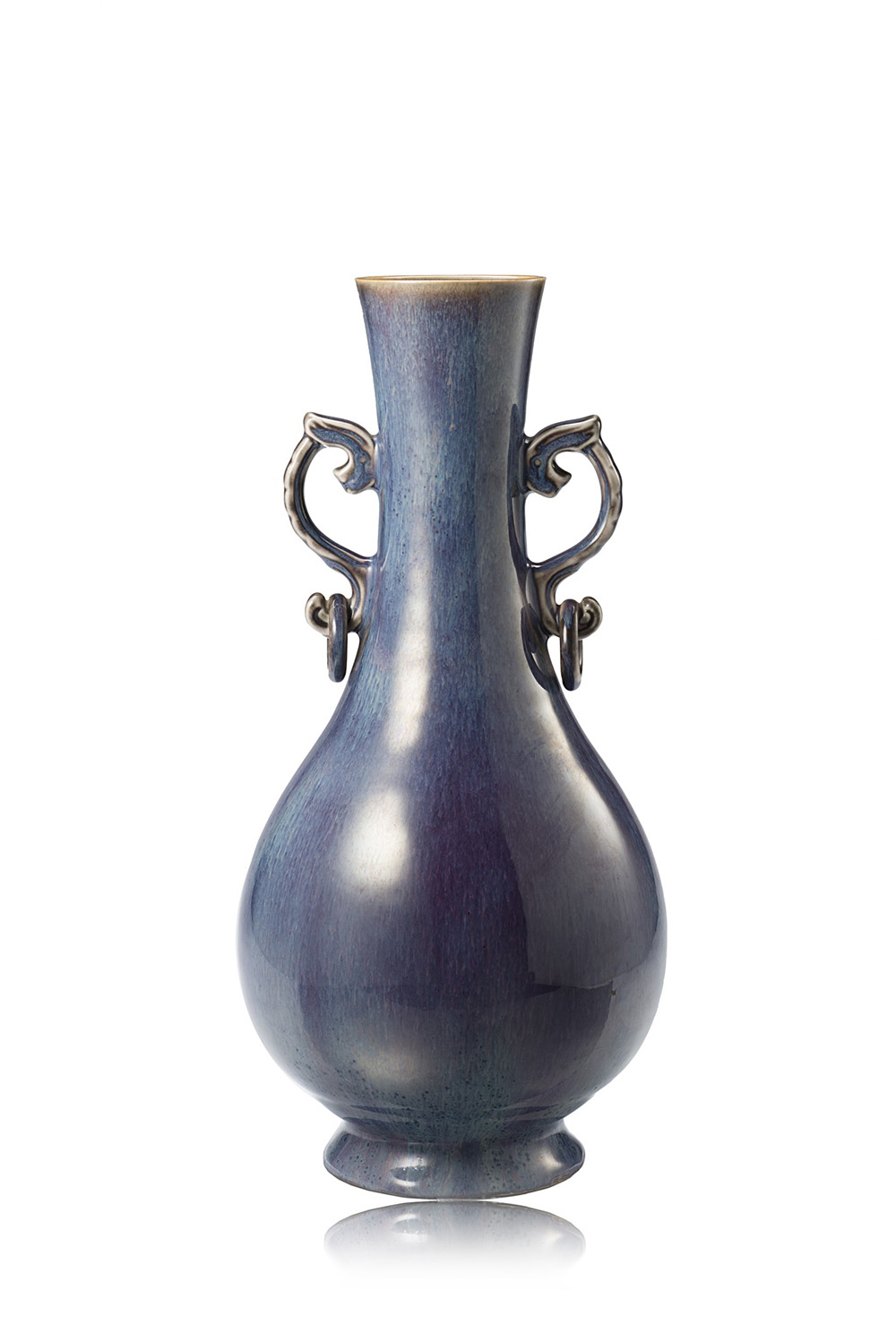 Vaso a bottiglia biansato con anelli con invetriatura flambÈ sui toni del viola Cina, sec. XX A flambÈ vase with twin fixed ring handels, the glaze of a purple tone China, 20th century (h. 37 cm.)