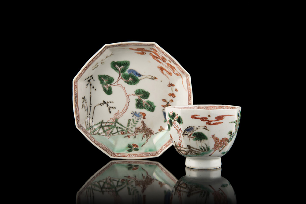 Tazzina con piattino di forma ottagonale in porcellana Famiglia Verde decorata con scena di paesaggio (difetti) Cina, periodo Qianlong (1735-1796) An octagonal Famille Verte porcelain cup and saucer decorated with landscape scene (flaws) China, Qianlong period (1735-1796) (diam. 12 cm.)