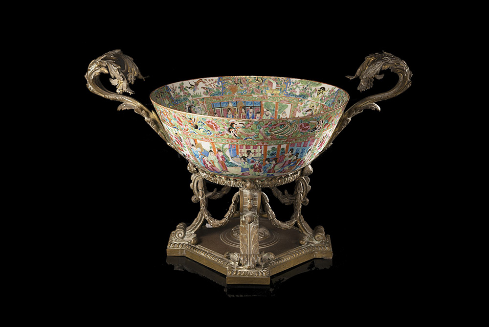 Grande ciotola in porcellana Famiglia Rosa cantonese, decorata con smalti e doratura con figure in scene di interni e ricco sfondo floreale, con base in bronzo dorato (alcune mancanze) Cina, sec. XIX (la porcellana) Provenienza: Sotheby's Milano, 8 Giugno 1999, lotto 69 (diam. 41 cm.)