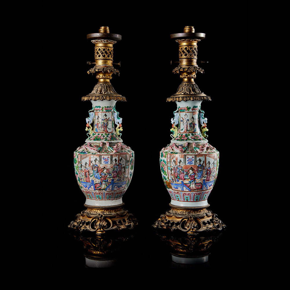 Coppia di vasi in porcellana Famiglia Rosa montati a lampada con inserti in...