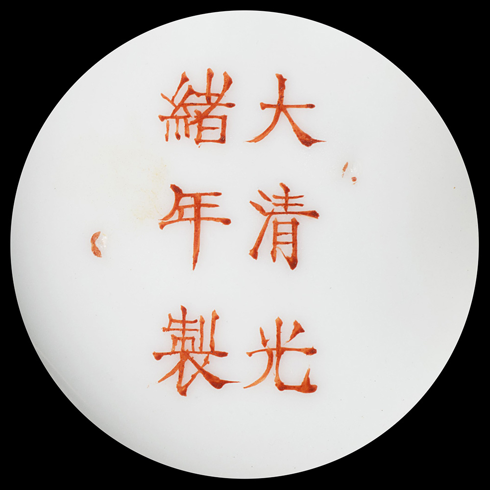 Ciotola in porcellana decorata con fiori policromi su fondo rosa, l'interno turchese, marchio apocrifo Guangxu sul fondo, con base in legno Cina, sec. XX A small porcelain bowl decorated with flowers on a pink ground, the interior turquoise, with apocryphal Guangxu mark to the base China, 20th century (diam. 11,5 cm.)