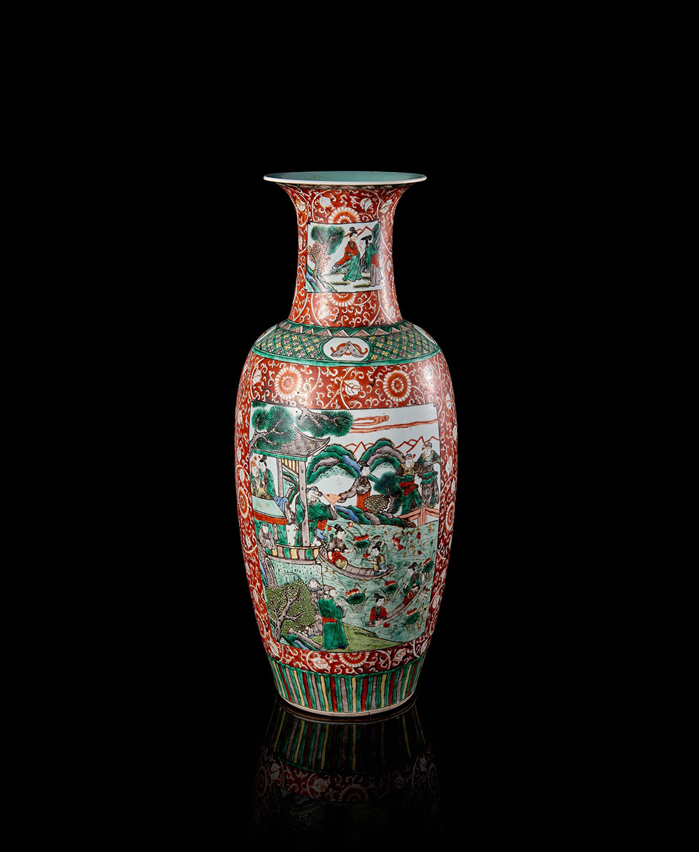 Vaso in porcellana Famiglia Verde su fondo color corallo decorato con figure in paesaggio e motivi floreali Cina, sec. XIX A coral-ground Famille Verte porcelain vase, decorated with panels enclosing figures in landscapes surrounded by floral scrolls China, 19th century (h. 59 cm.)