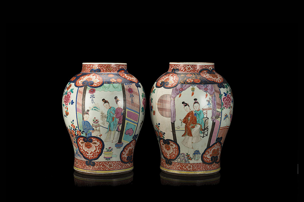 Coppia di potiche in porcellana Imari e Famiglia Rosa decorate con dame in...