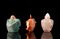 Tre snuff bottles in quarzo rosa, quarzo verde e in agata con tappo in...
