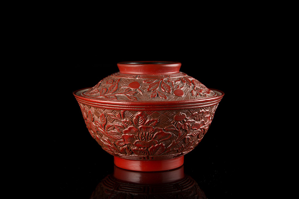 Coppa con coperchio in porcellana a imitazione di lacca color cinabro decorata a motivi floreali, su fondo geometrico Cina, sec. XIX A porcelain bowl and cover glazed in red, imitating cinnabar lacquer,decorated with floral motifs on a geometric ground China, 19th century (diam 13,5 cm.)