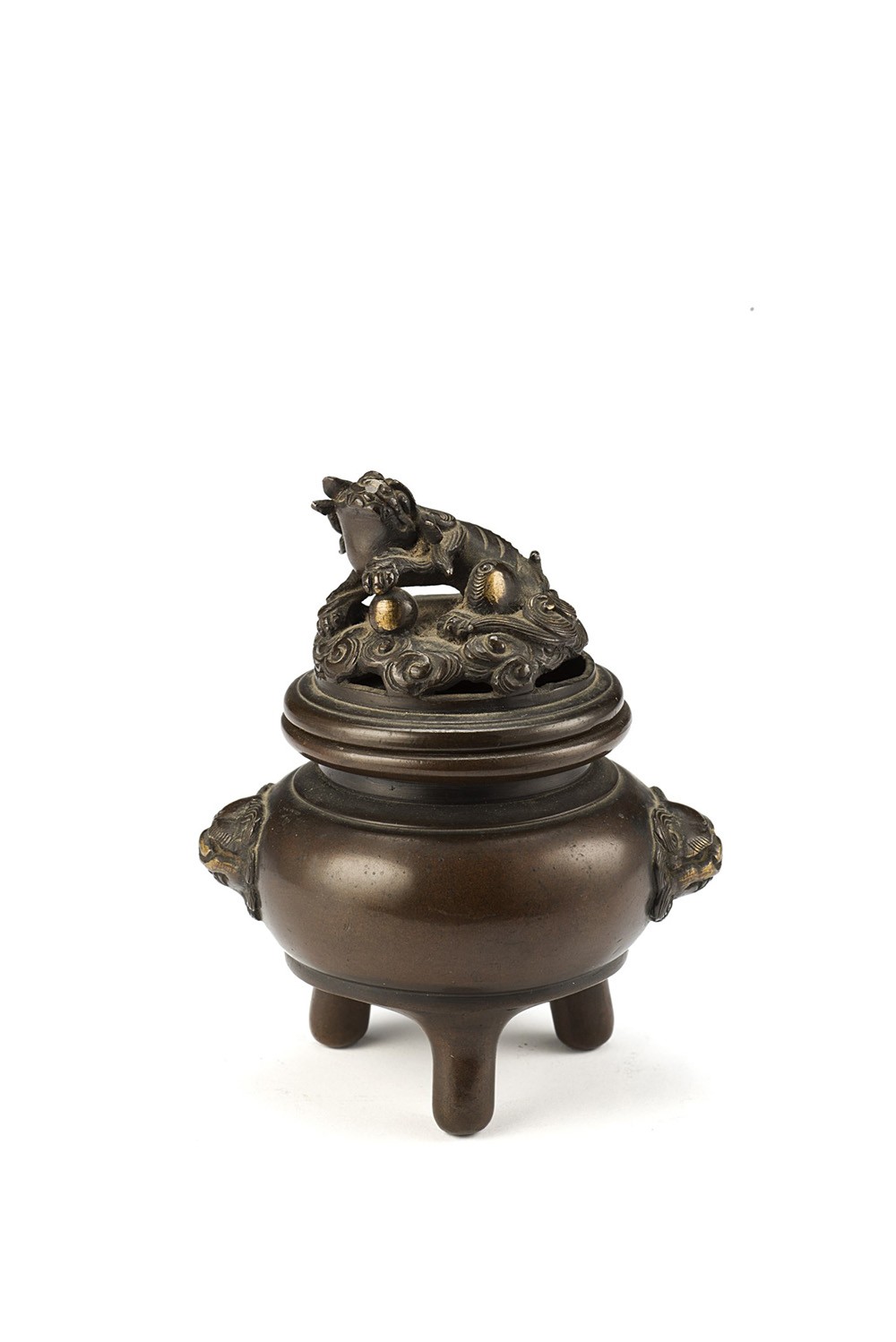 Bruciaincenso tripode in bronzo con anse leonine e coperchio sormontatao da leone buddhista Cina, tarda dinastia Ming, sec. XVII A bronze tripod censer and cover with two lion handles China, late Ming dynasty, 17th century Å(h. 12 cm.)