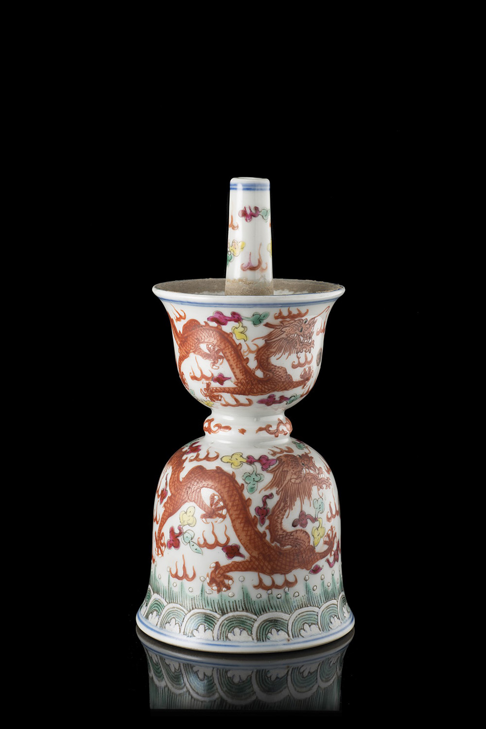 Porta candele in porcellana policroma decorato con coppia di draghi in rosso ferro alla ricerca della perla sacra (lievi difetti) Cina, epoca Guangxu (1875-1908) A polychrome porcelain candlestick decorated with two iron-red dragons chasing the sacred pearl (minor flaws) China, Guangxu period (1875-1908) (h. 22 cm.)