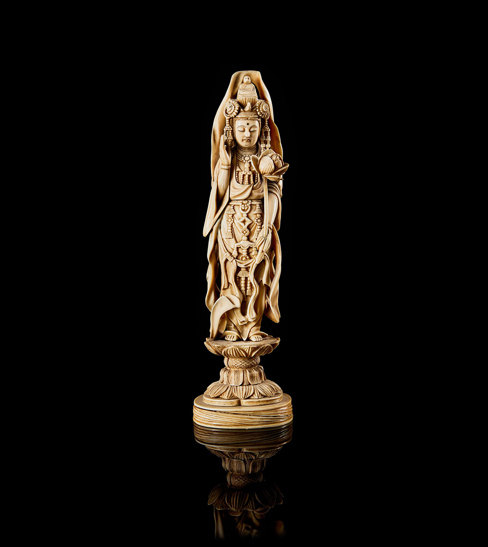 Guanyin con fiore di loto in avorio e sigillo alla base Cina, sec. XX An ivory sculpture of a Guanyin with lotus flower, seal to the base China, 20th century (h. 28.5 cm)