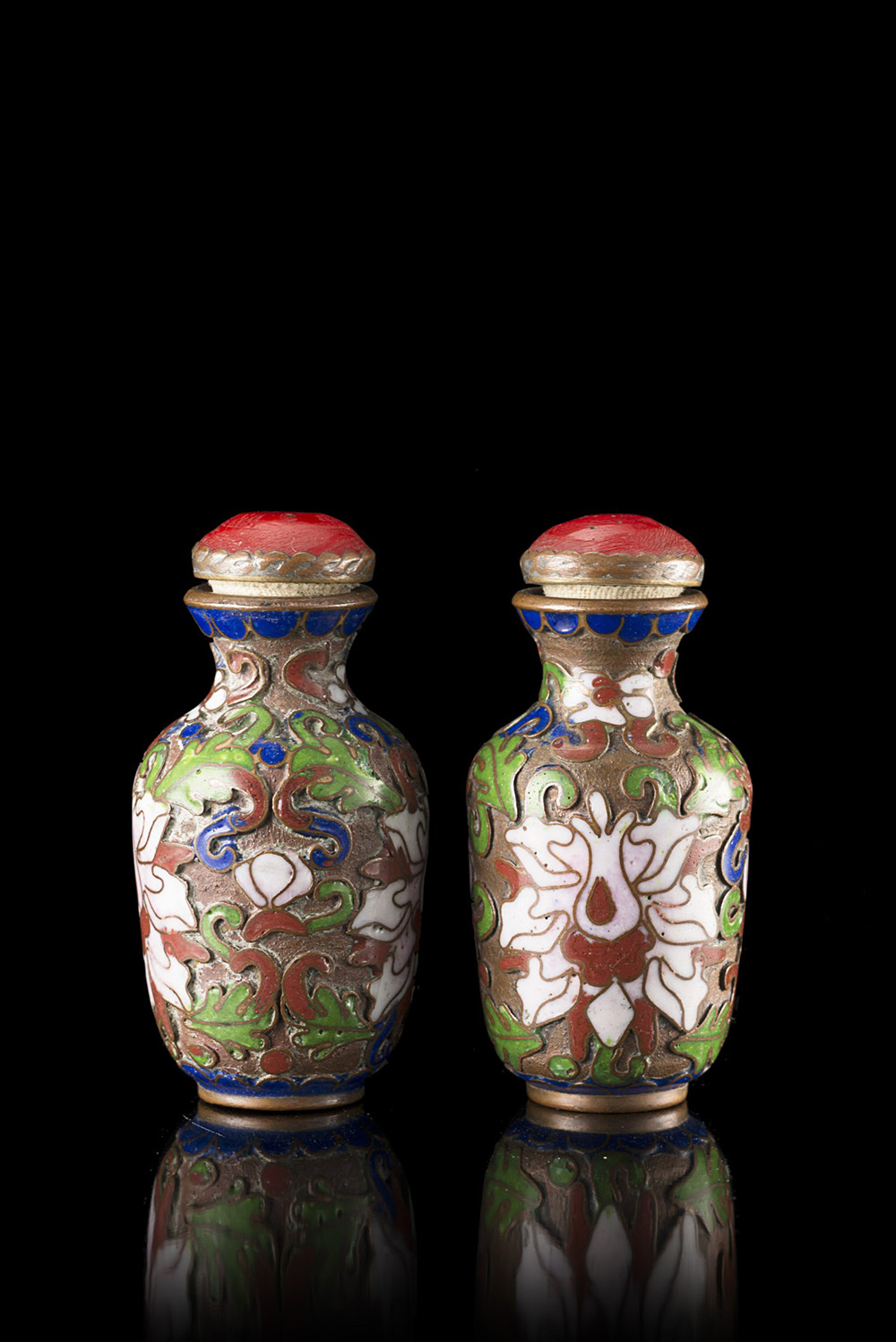 Coppia di snuff bottle in cloisonne con decorazione floreale, con scatola originale Cina, sec. XX A pair of cloisonnÈ snuff bottles with floral decoration, with box China, 20th century (h. 6 cm.)