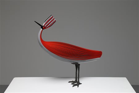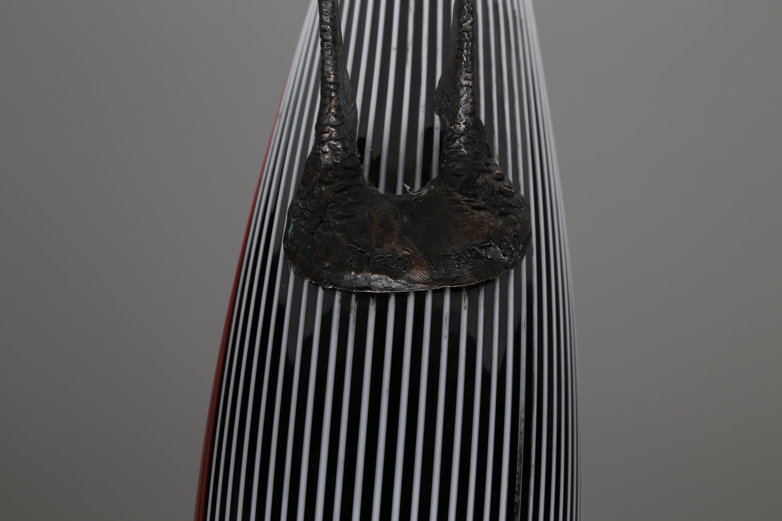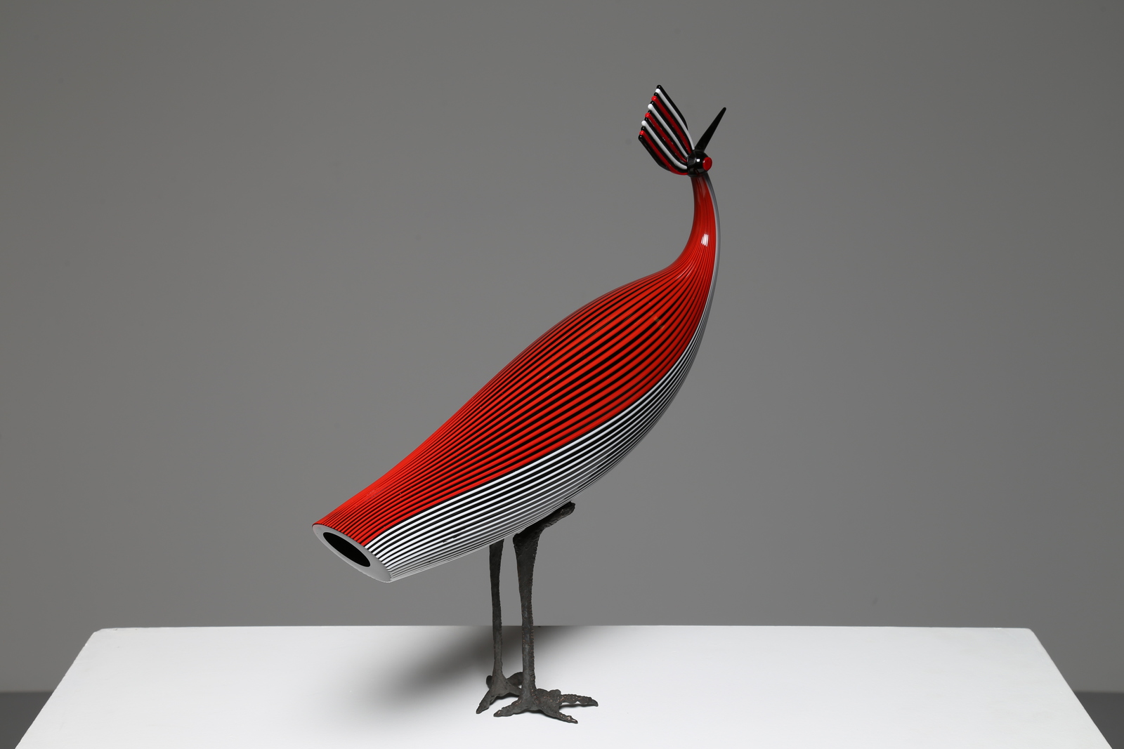 TICCO' MARIO Pavone in vetro soffiato a canne rosso nero e bianco, zampe in bronzo, manifattura Veart, Murano 1982. Pubblicazioni; M. Barovier, Il Vetro a Venezia, Federico Motta Editore, Milano p. 316; Mille anni di arte del vetro a Venezia, catalogo della mostra (Venezia 1982) a cura di Rosa Barovier Mentasti, Attilia Dorigato, Albrizzi, Venezia 1982, p. 298 . . Cm 55,00 x 53,00 x 12,50. Firma alla base