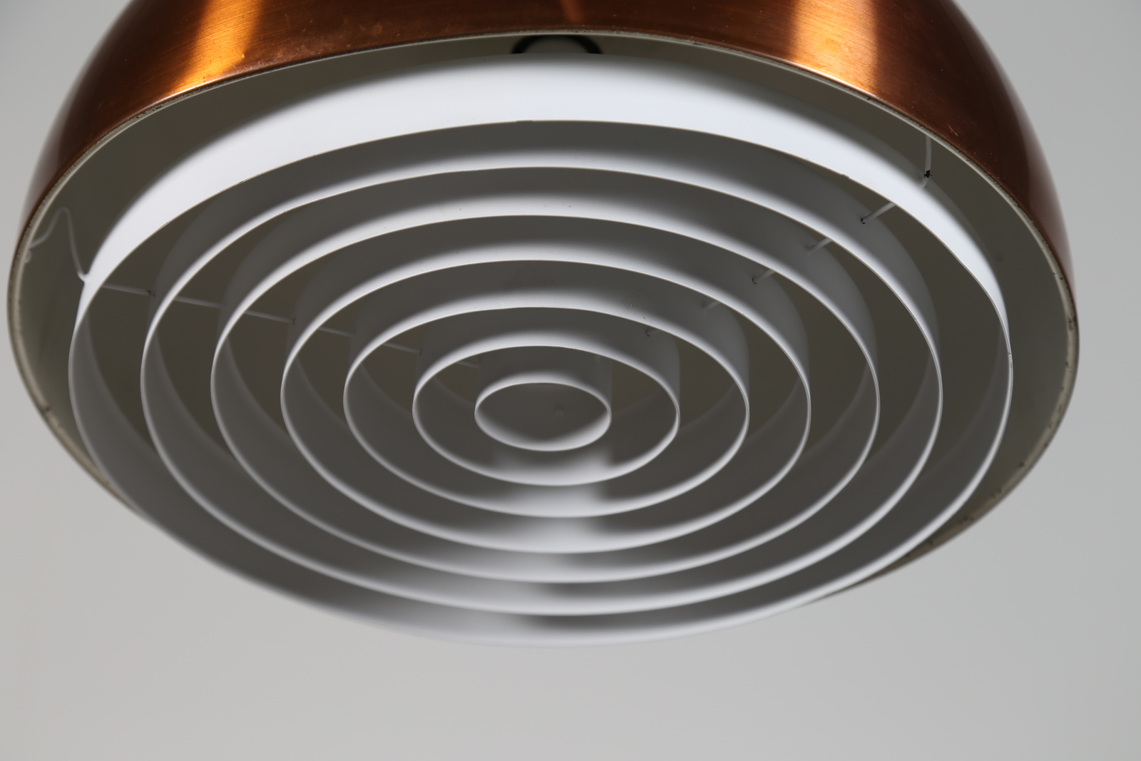 VILHELM WOHLERT e JORGEN BO Lampada a sospensione in rame spazzolato e plastica, mod. Louisiana, per Louis Poulsen, anni 60 . -. Cm 40,00 x 80,00 x 40,00.