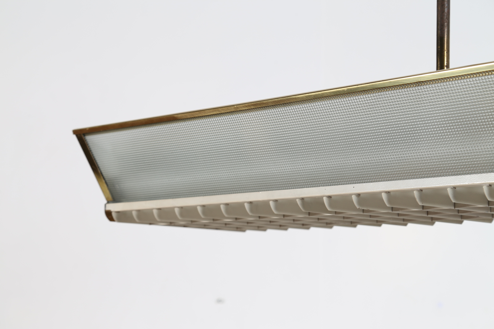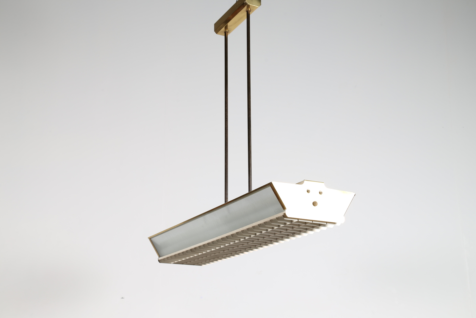 MANIFATTURA ITALIANA Coppia di lampade a sospensione in alluminio, ottone e vetro per. B.S. anni 60 . -. Cm 124,00 x 116,00 x 38,00.