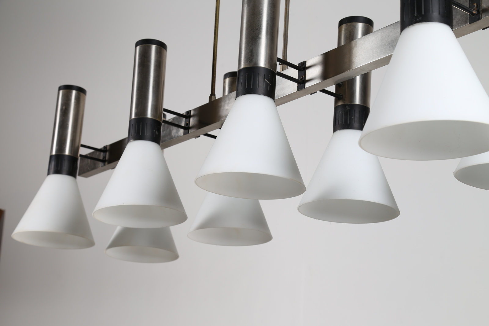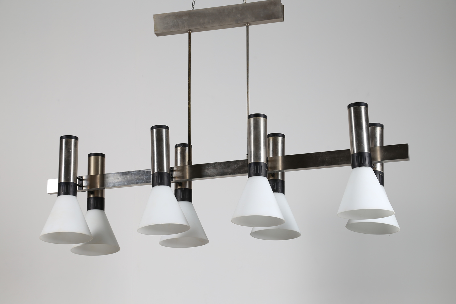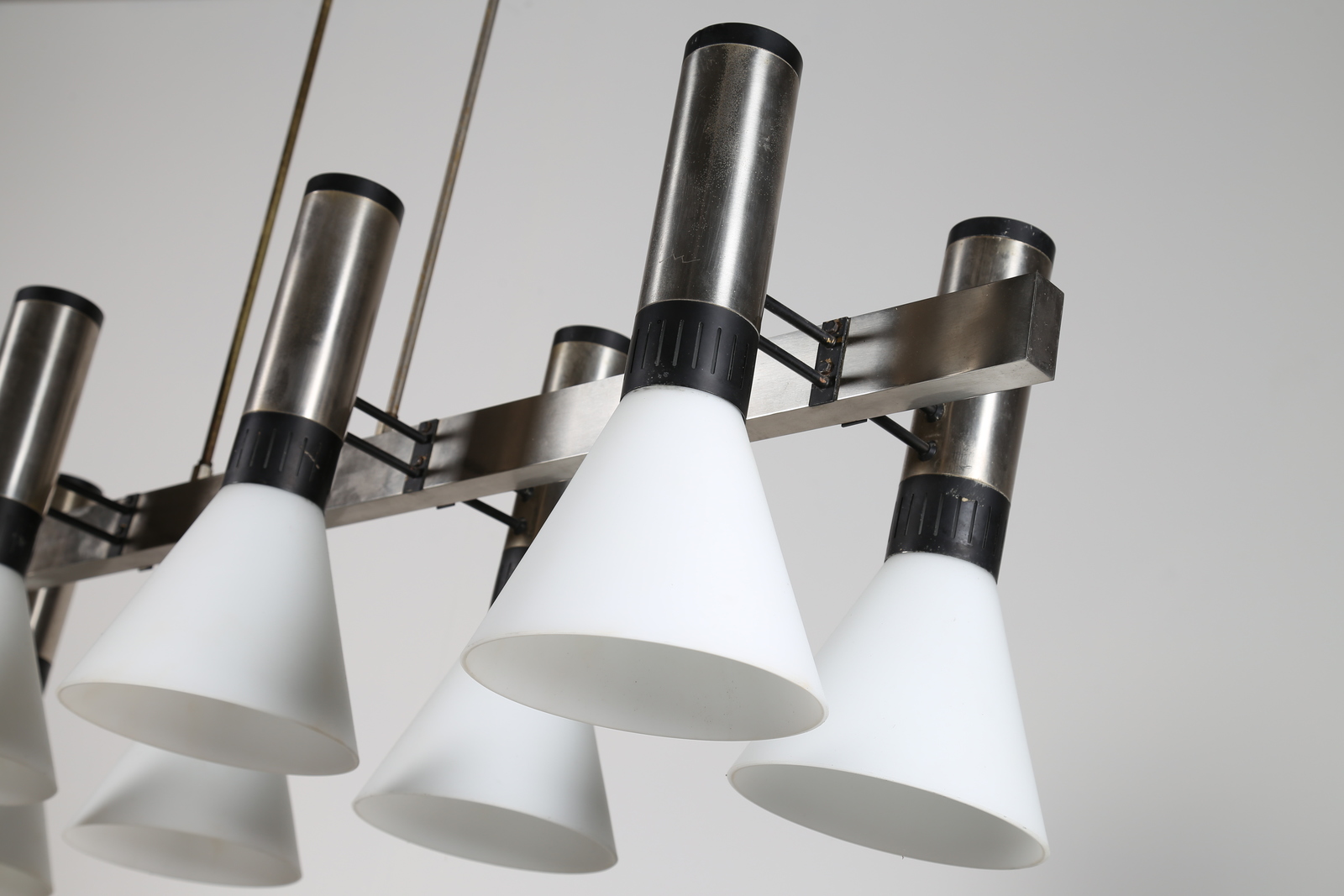 STILNOVO Lampada a sospensione otto luci in ottone nichelato, metallo laccato e vetro satinato, Stilnovo anni 50. Pubblicazioni; Domus num. 361 dicembre 1959 pagina pubblicitaria . Metallo laccato e ottone. Cm 150,00 x 90,00 x 45,00. Etichetta originale presente