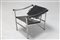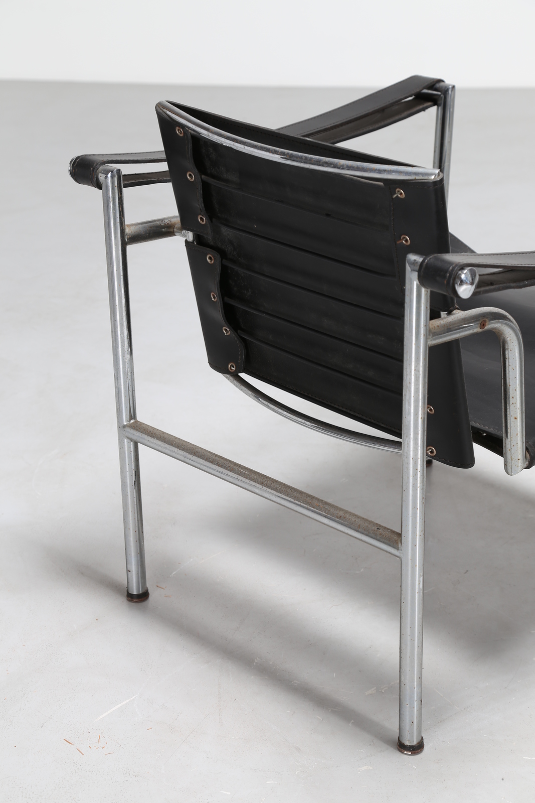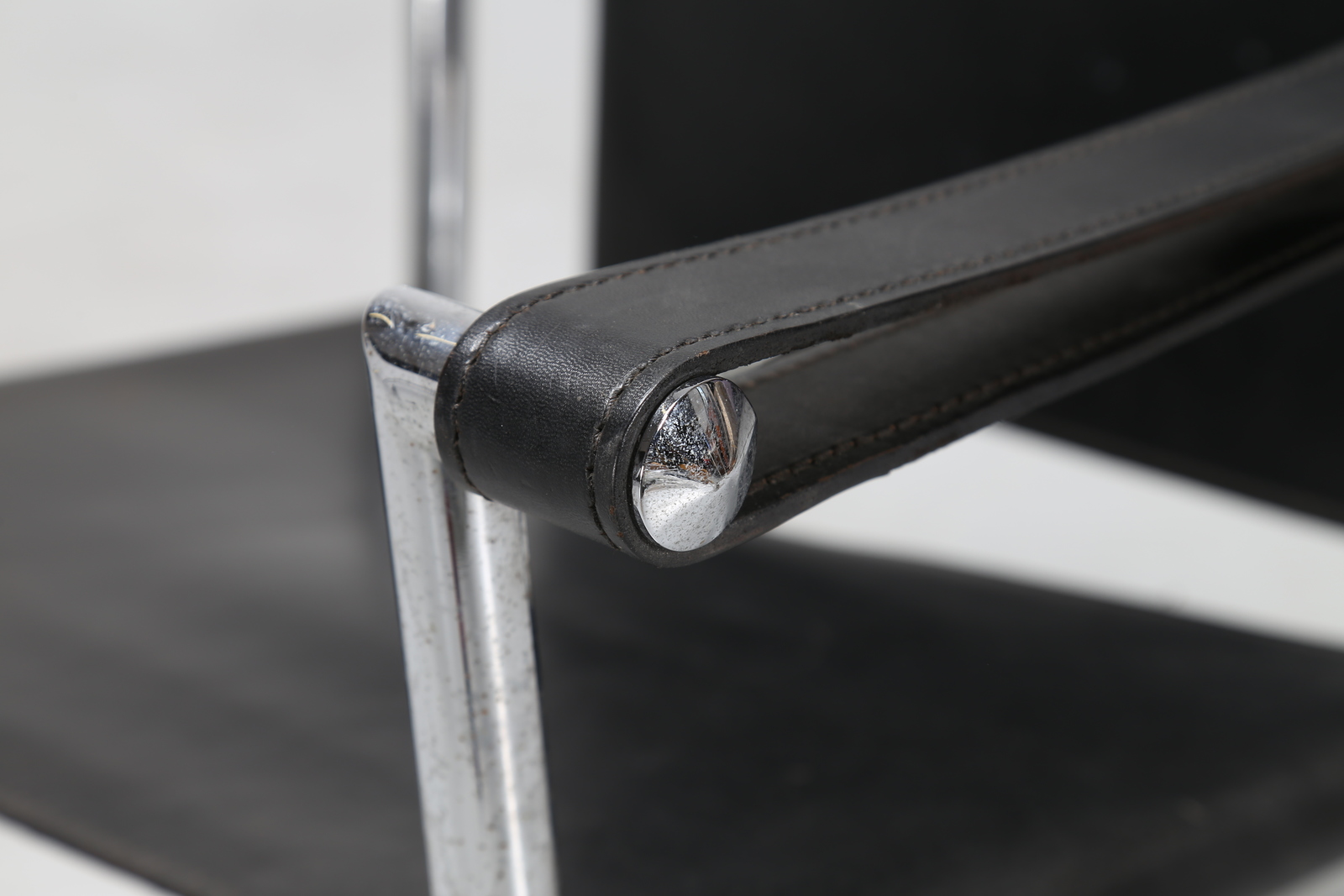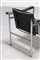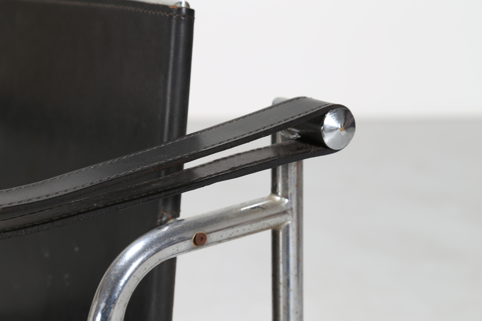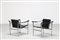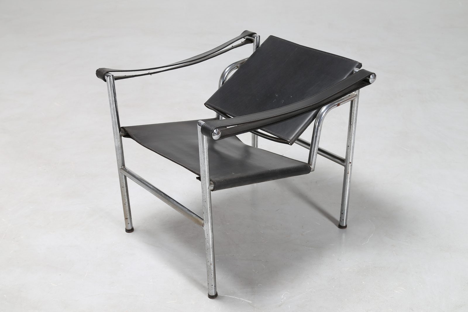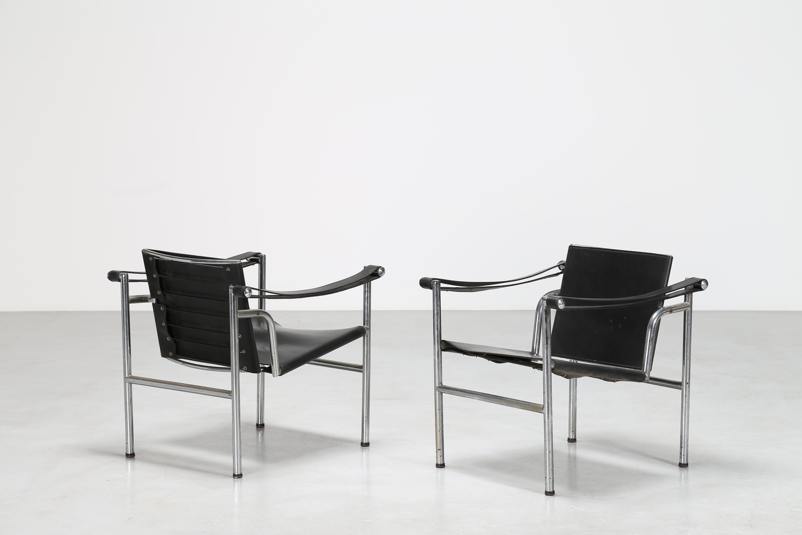 LE CORBUSIER Coppia di poltroncine basculanti in tubolare d’acciaio e cuoio,...