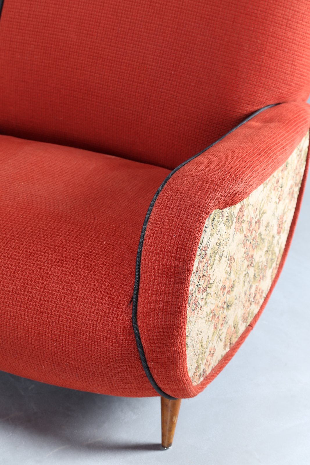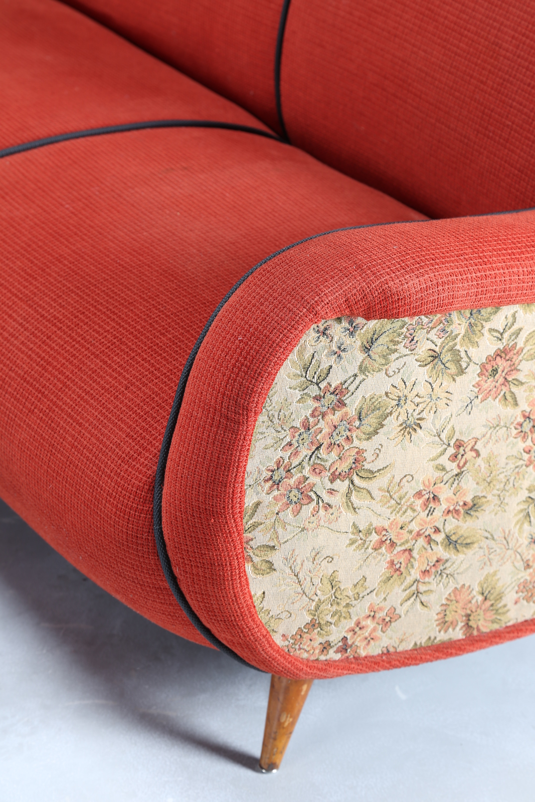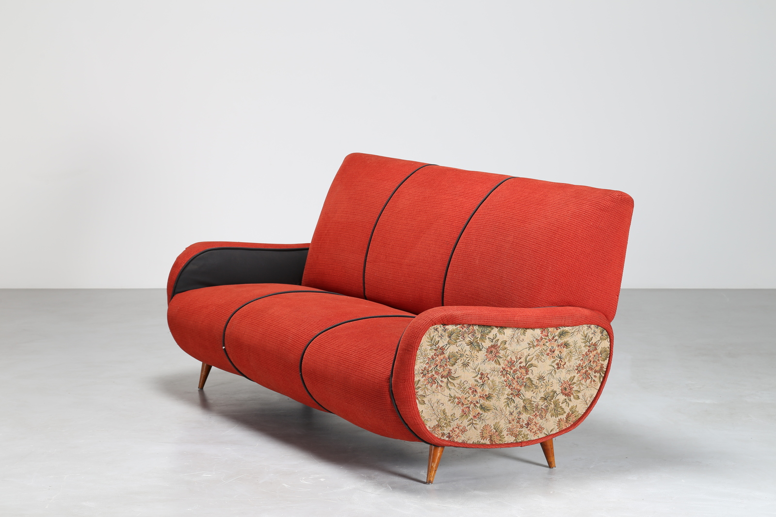 MANIFATTURA ITALIANA Divano in lego e tessuto, anni 50. -. Cm 188,00 x 81,00 x 80,00.