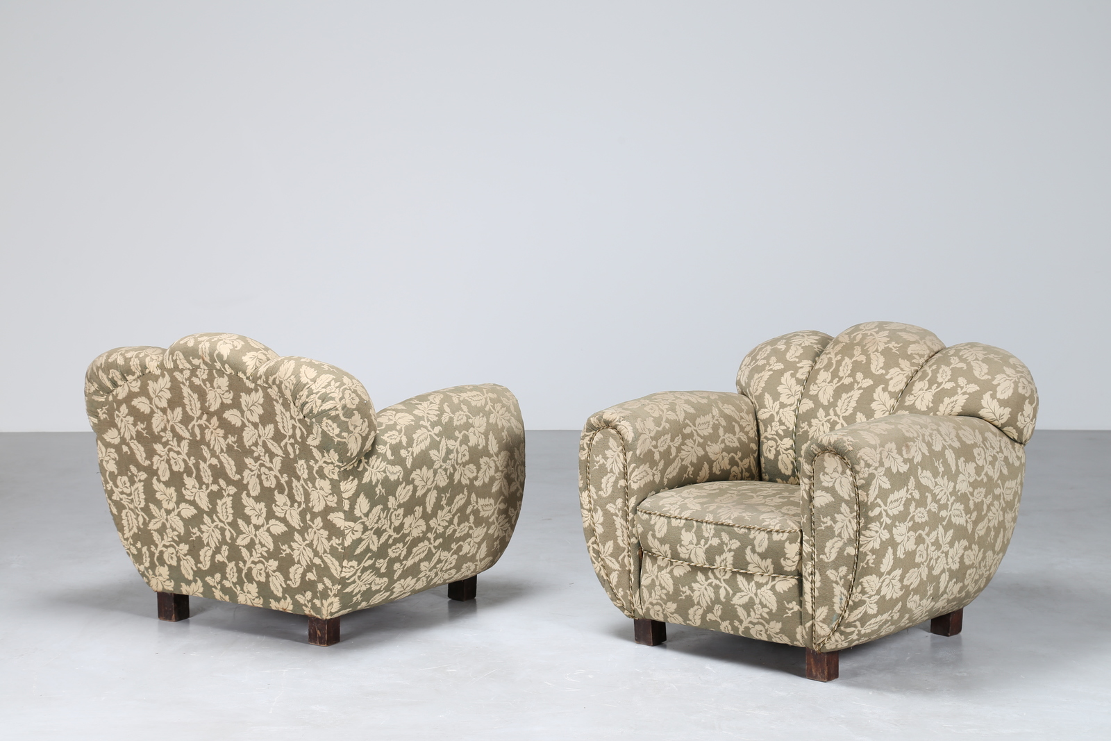 MANIFATTURA ITALIANA Coppia di poltrone in legno e tessuto, anni 50. -. Cm 88,00 x 82,00 x 80,00.