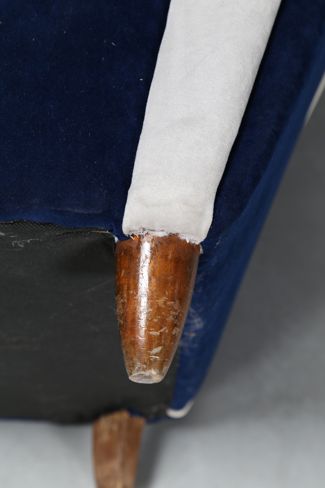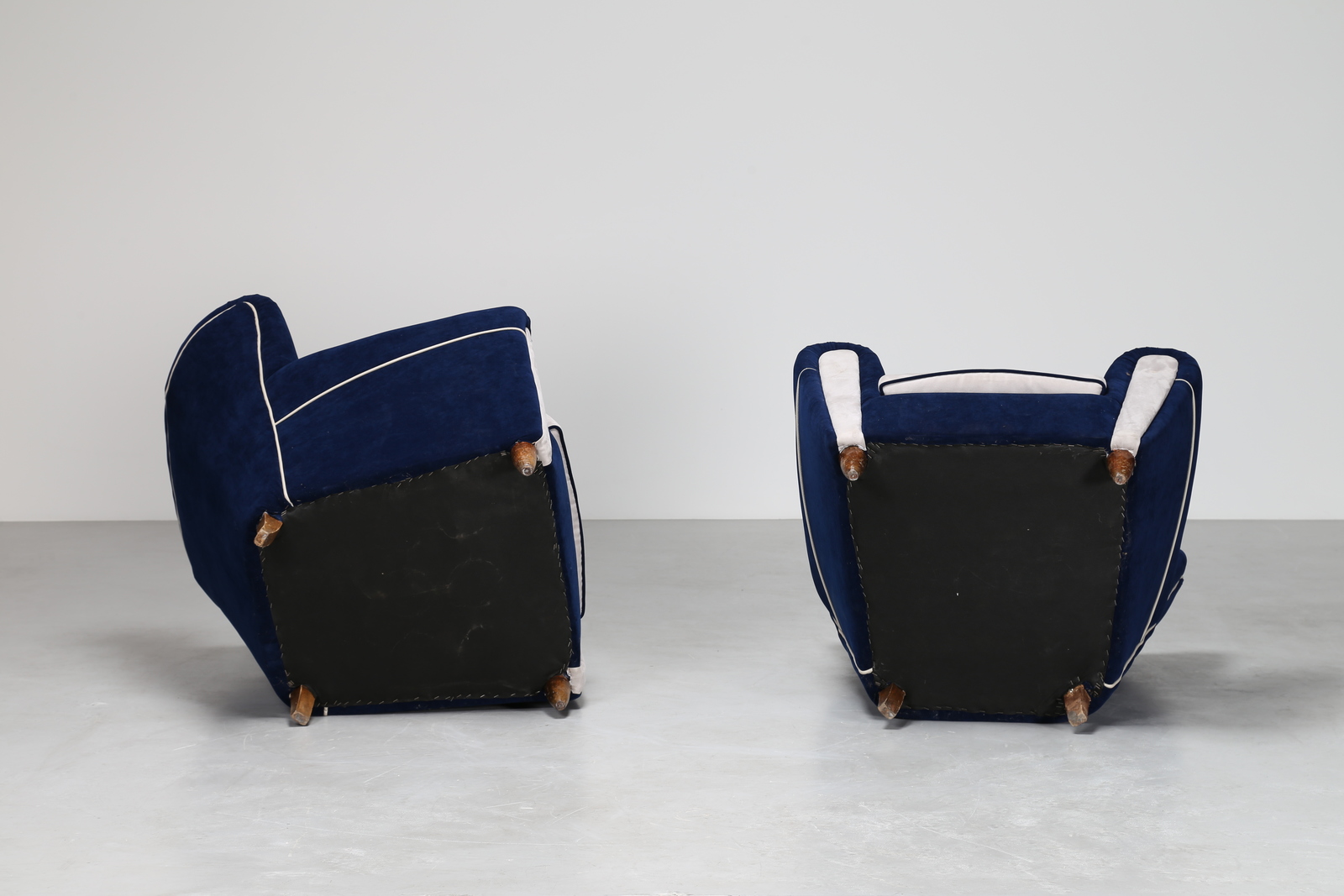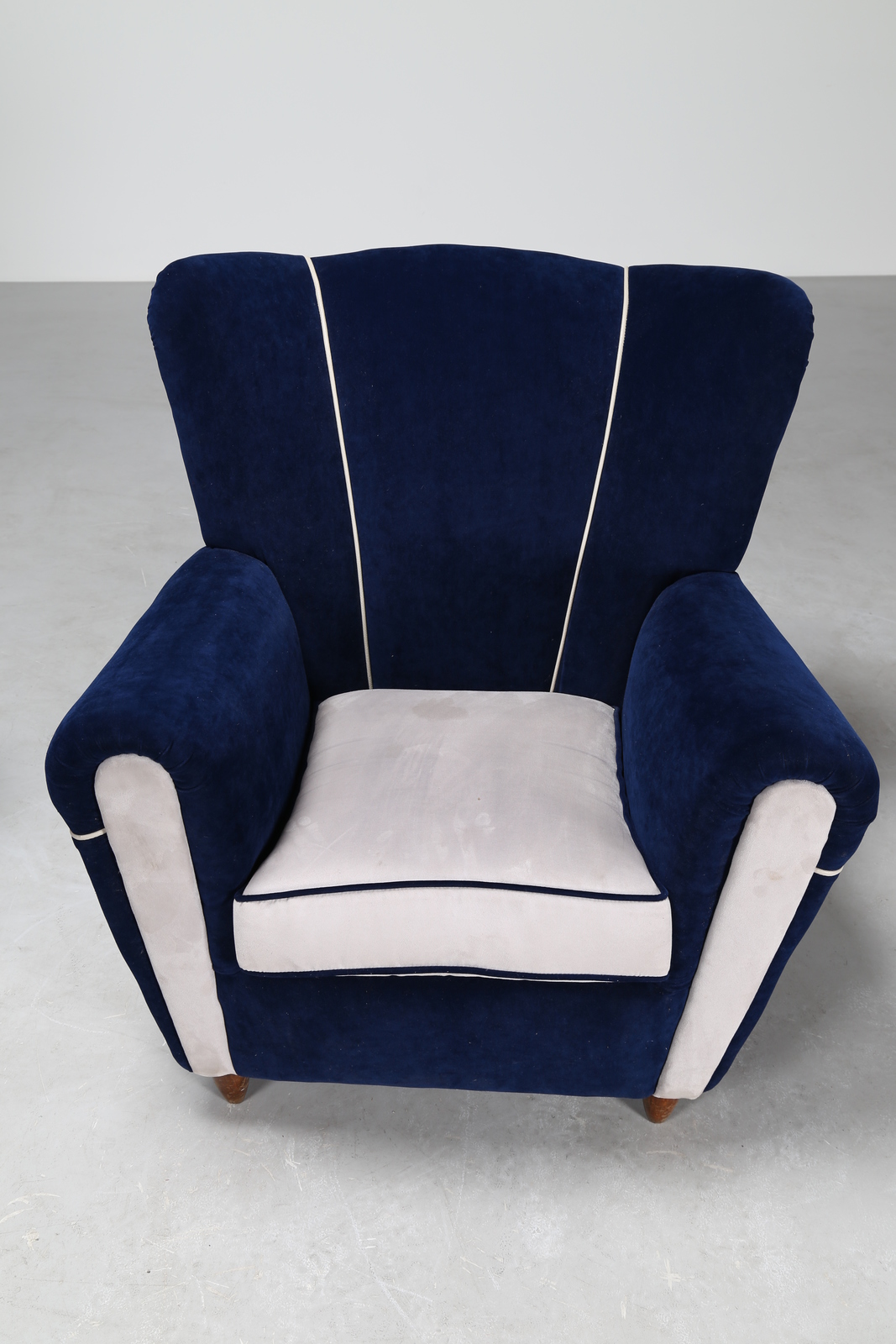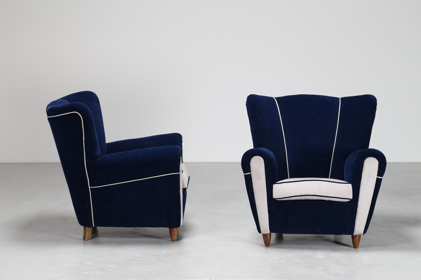 MANIFATTURA ITALIANA Coppia di poltrone con piedini in ottone e tessuto bicolere blue bianco anni 50. -. Cm 87,00 x 90,00 x 83,00.