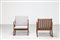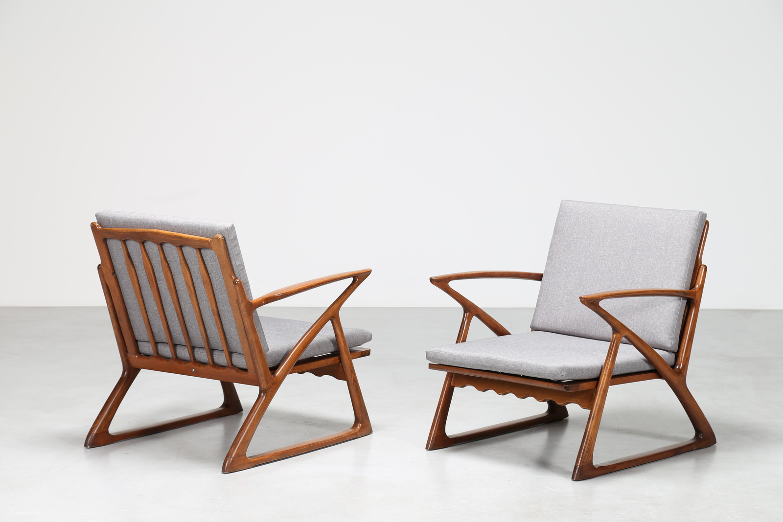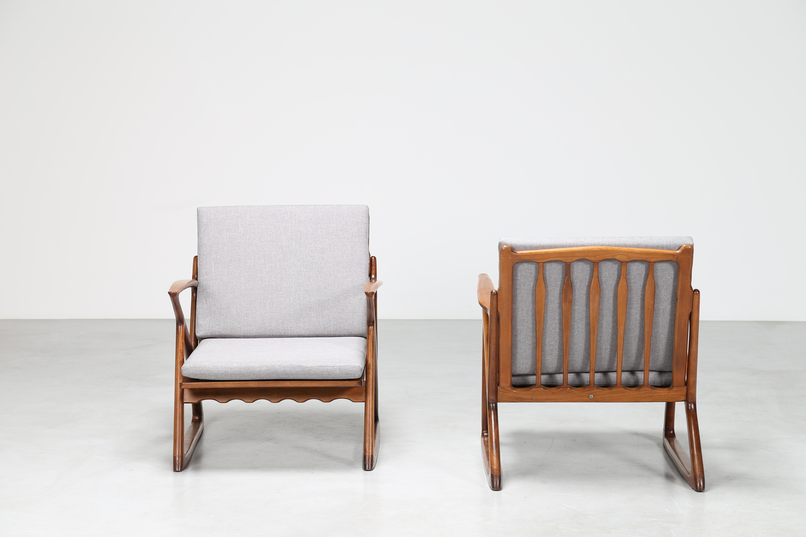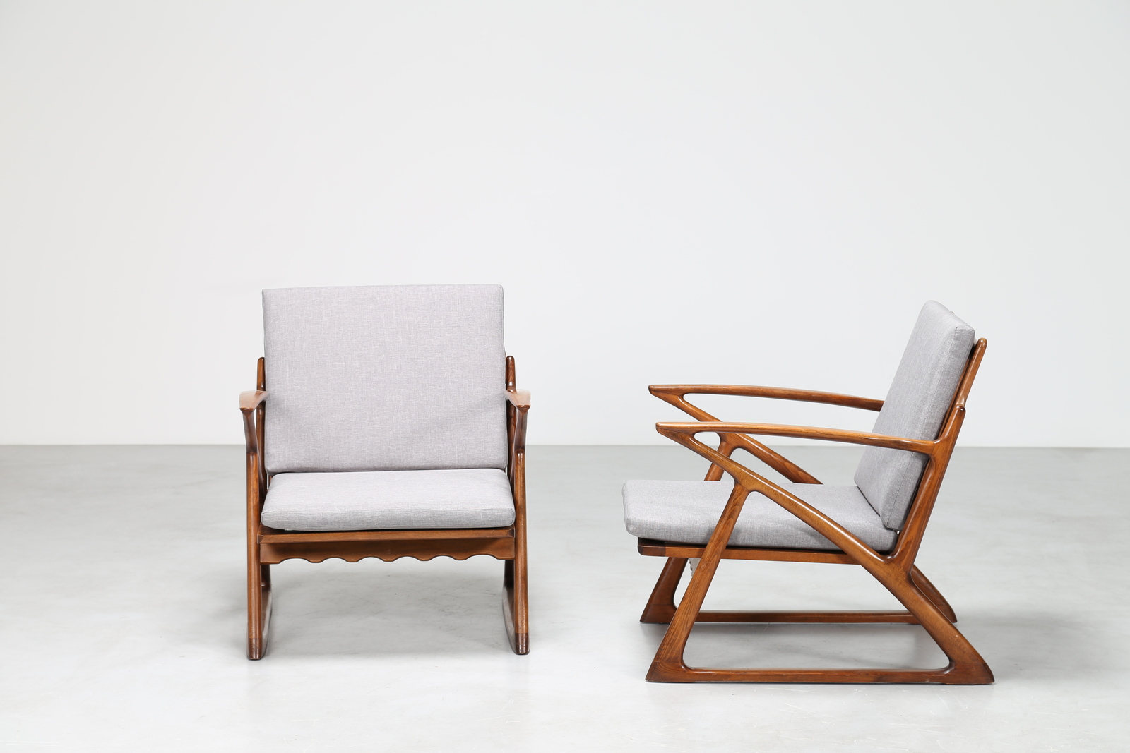 MOBILI PIZZETTI Coppia di poltrone in legno con cuscini in tessuto, anni 50....