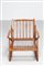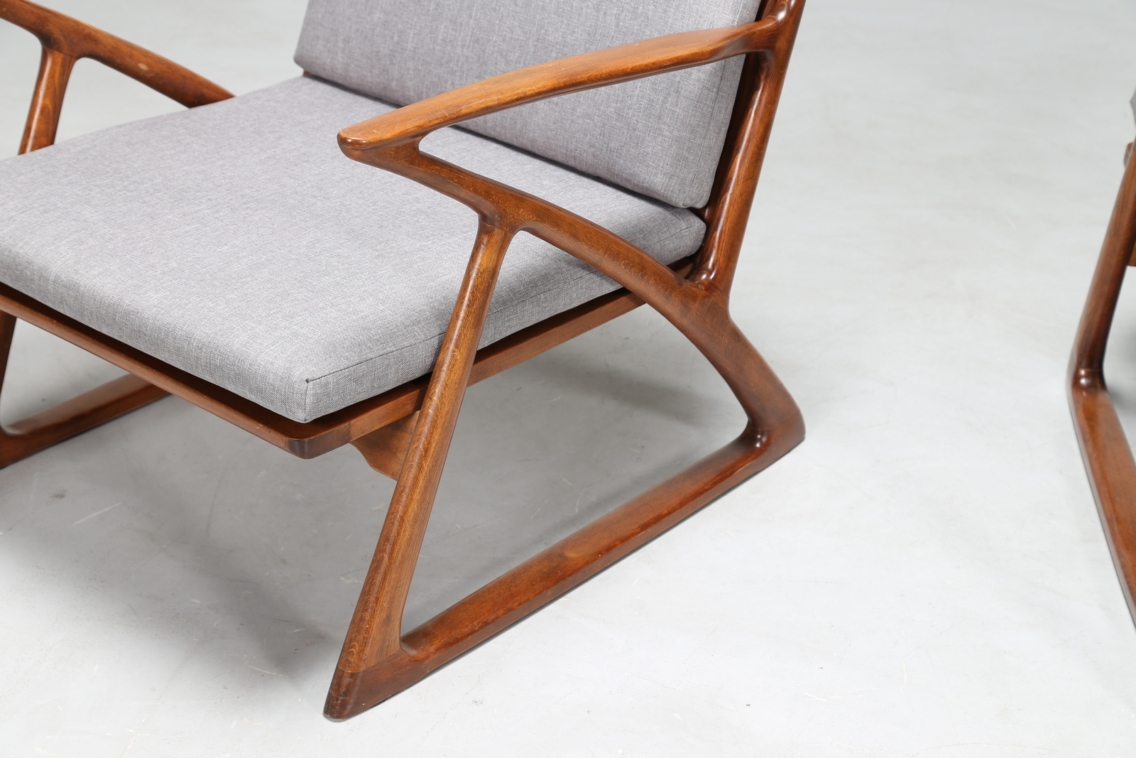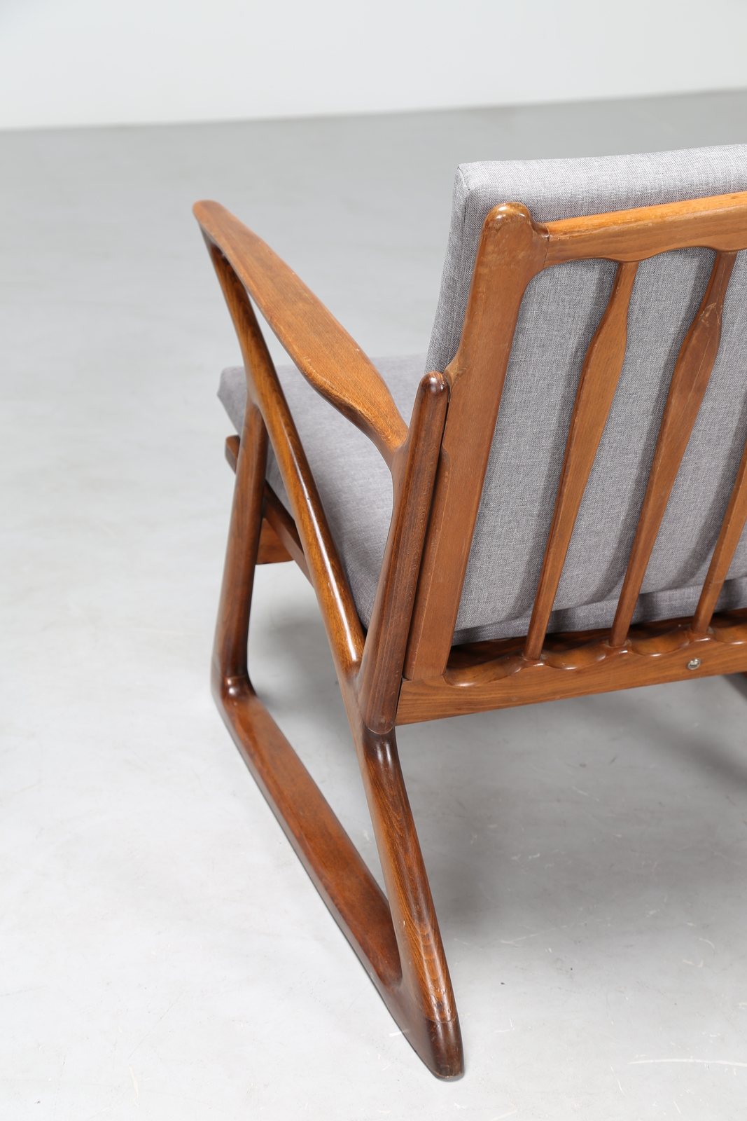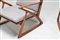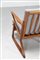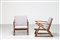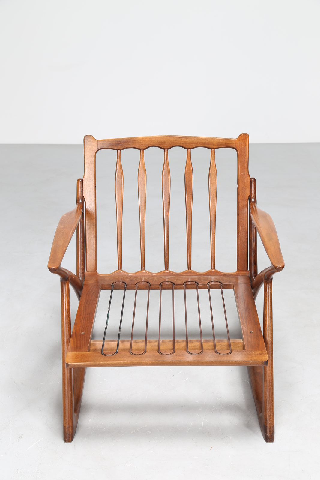 MOBILI PIZZETTI Coppia di poltrone in legno con cuscini in tessuto, anni 50....