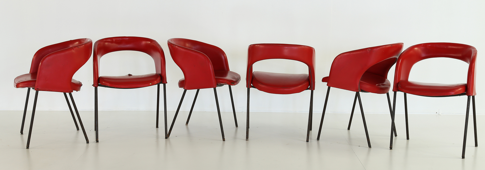 RINALDI GASTONE Sei poltroncine in tondino di ferro smaltato eskai. mod. P34. per Rima, anni 50. Pubblicazioni; Catalogo Gastone Rinaldi - Designer alla Rima a cura di Giuseppe e Jacopo Drago, pag.196. . Ferro e skai. Cm 53,00 x 75,00 x 53,00.