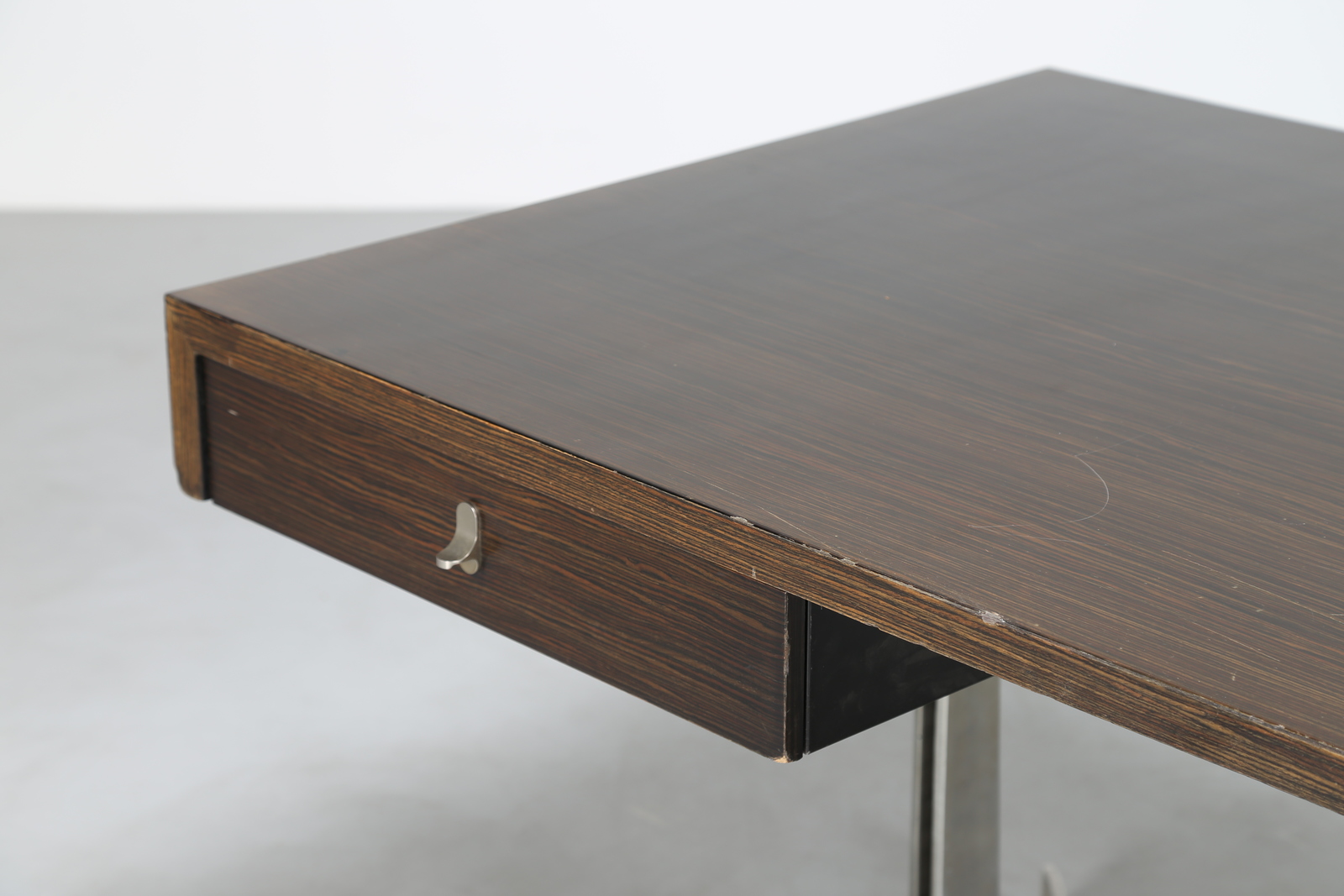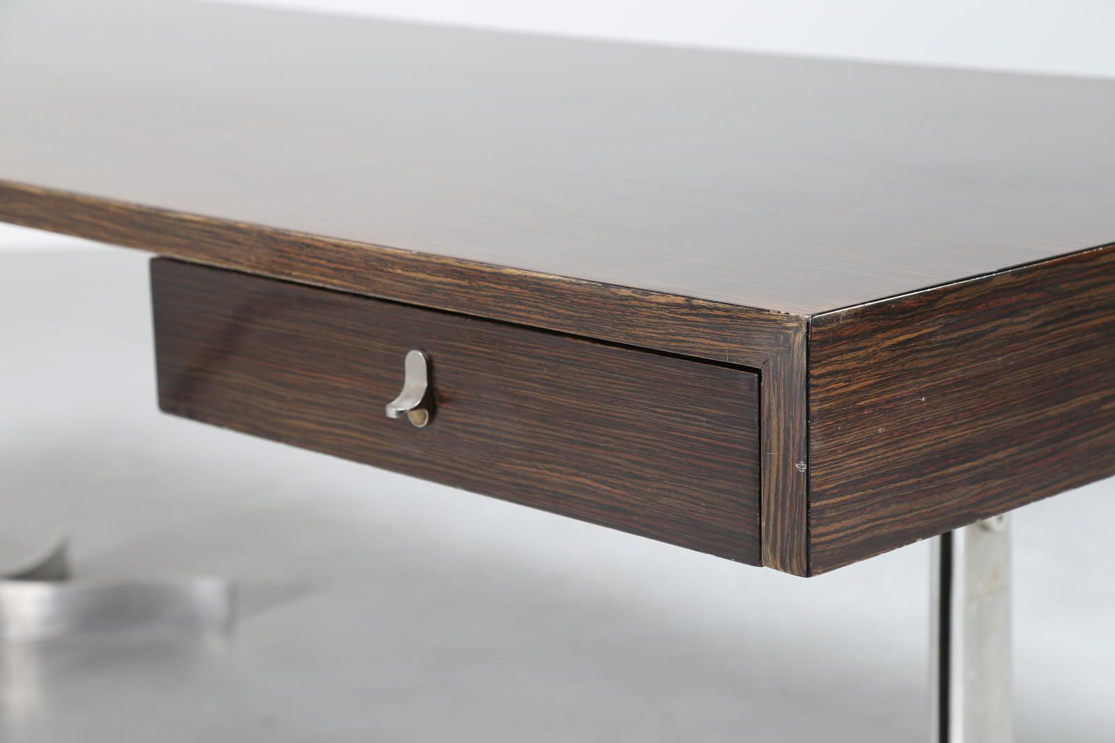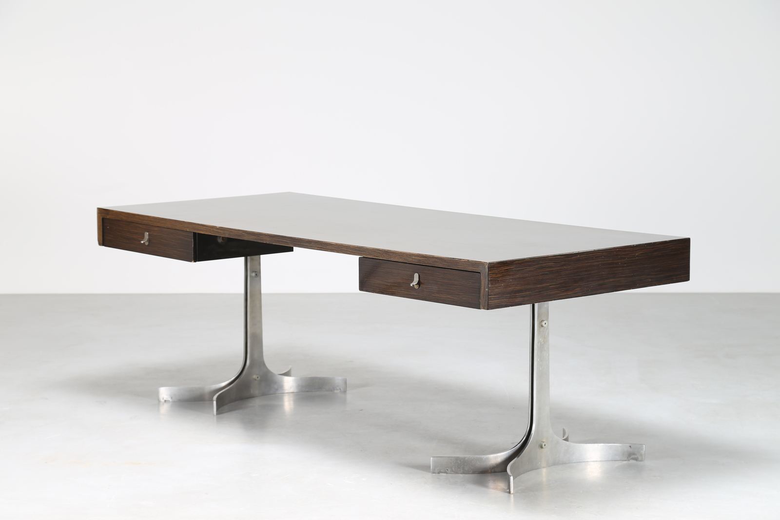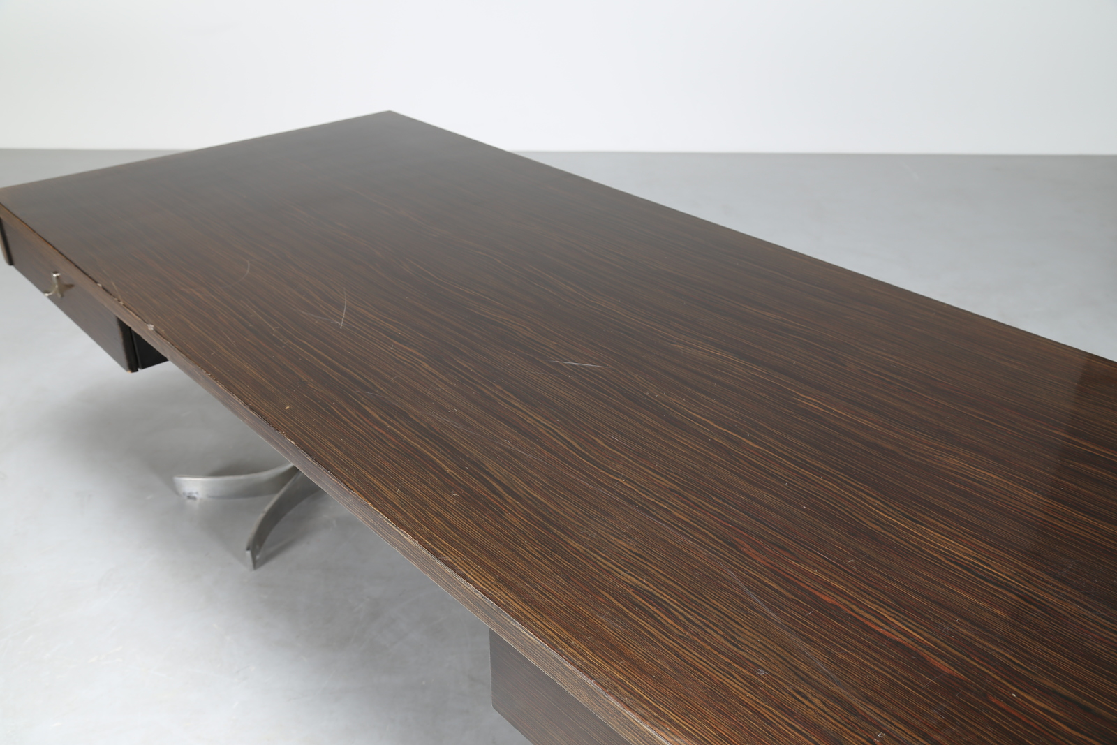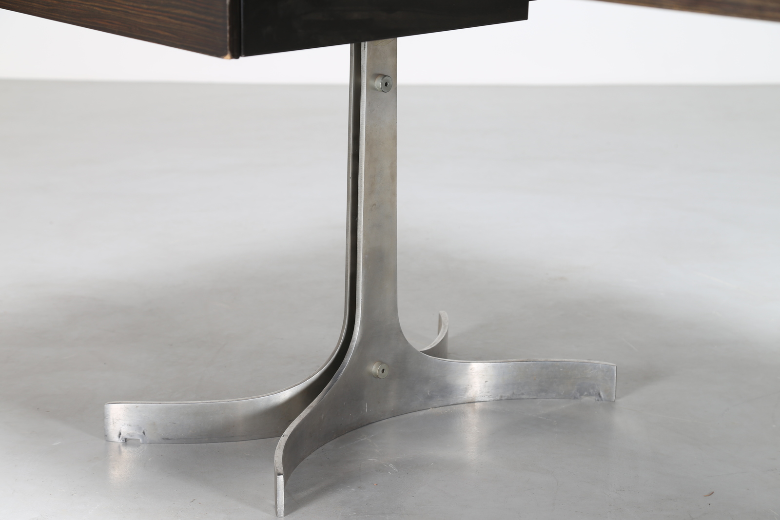TRAU Grande scrivania in alluminio spazzolato e piano in palissandro, produzione Trau Arredamenti Metallici S.P.A. Torino, anni 60. -. Cm 205,00 x 74,00 x 90,00.