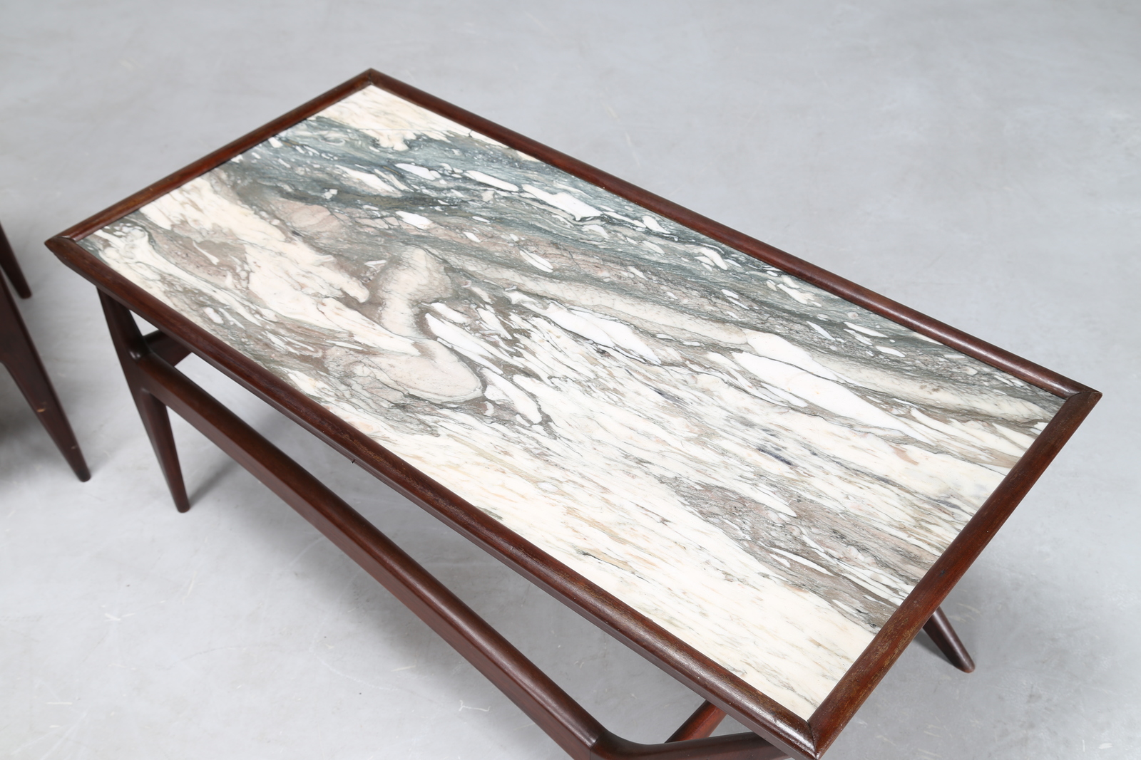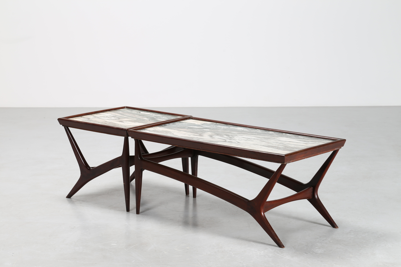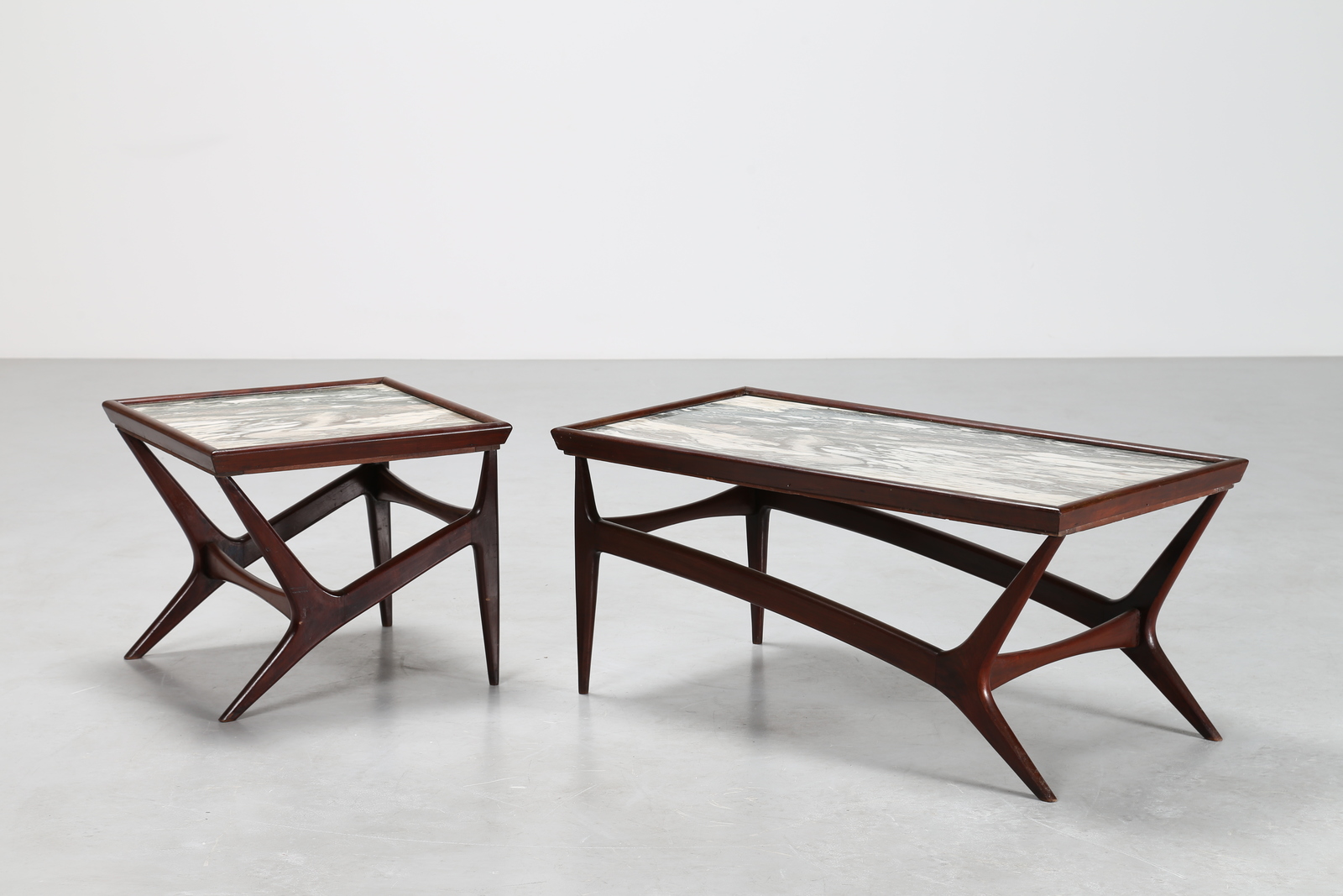 KAGAN VLADIMIR Attrib. Coppia di tavolini in legno con piano in marmo, anni 50. -. Cm 100,00 x 44,00 x 49,00. Misure: tavolino grande 44 x 100 x 49; tavolino piccolo 44 x 51,5 x 51,5