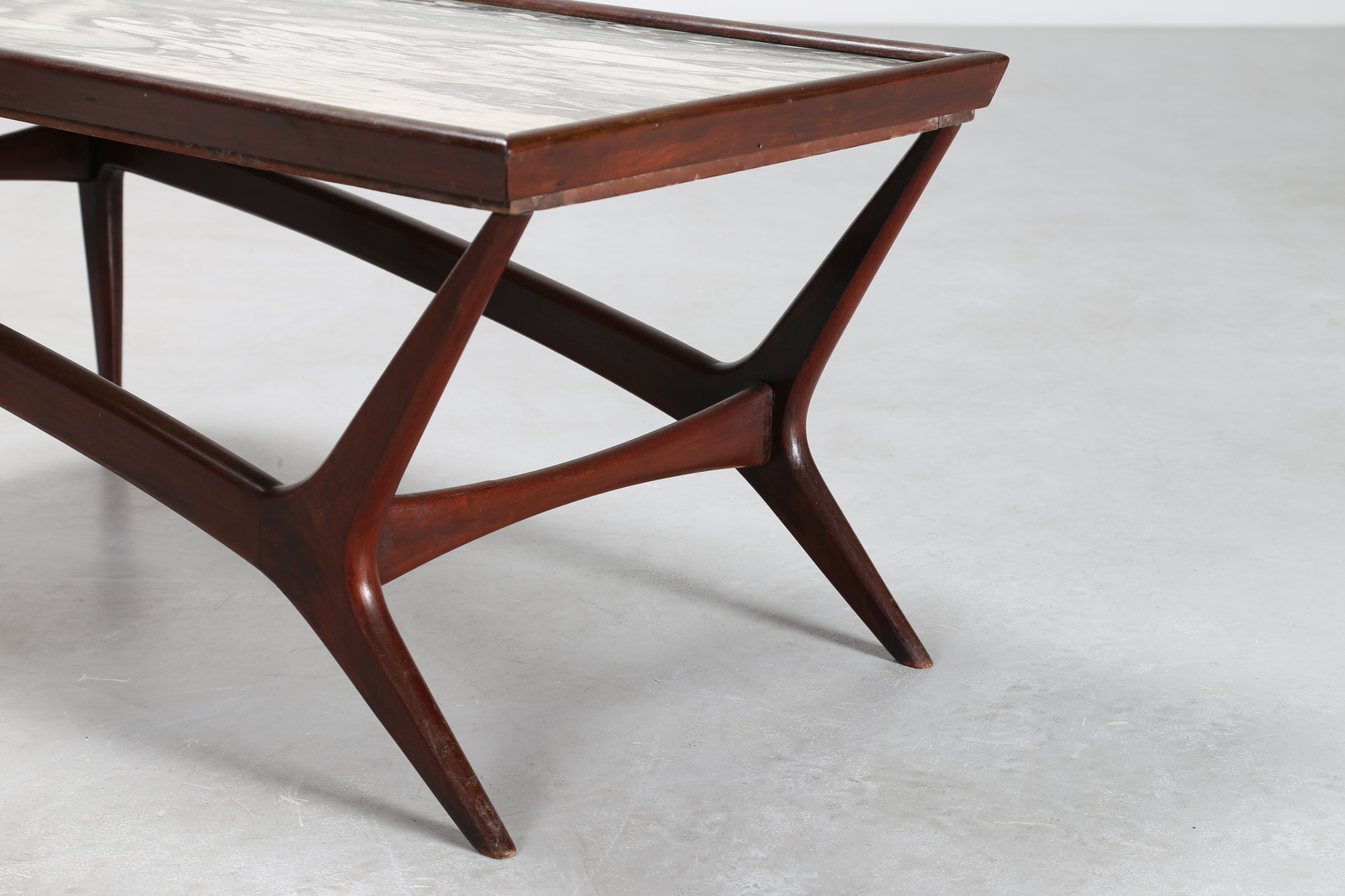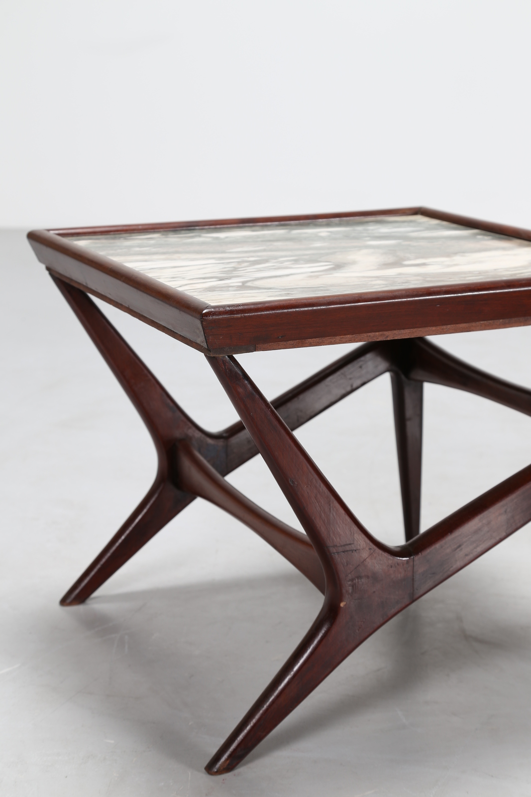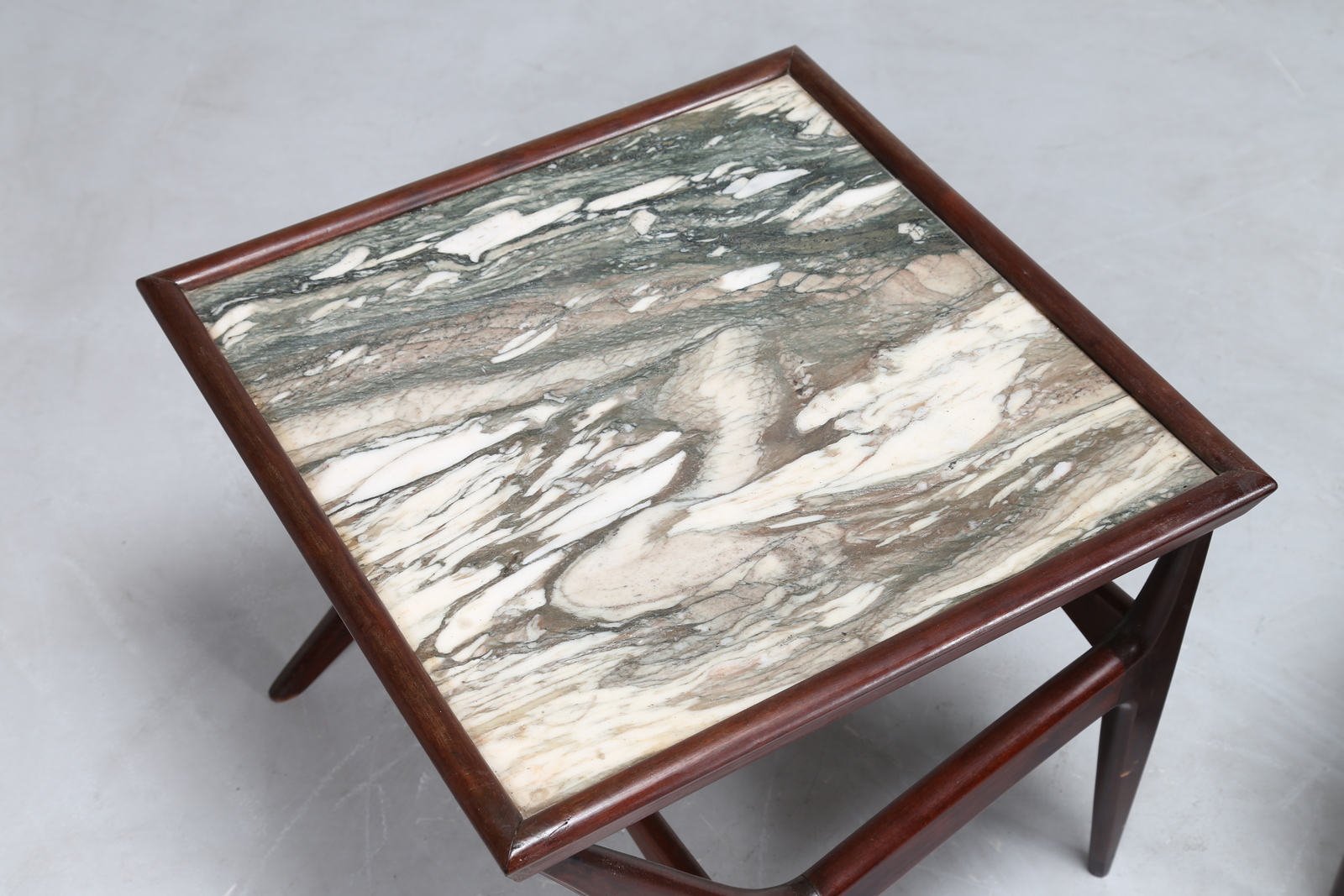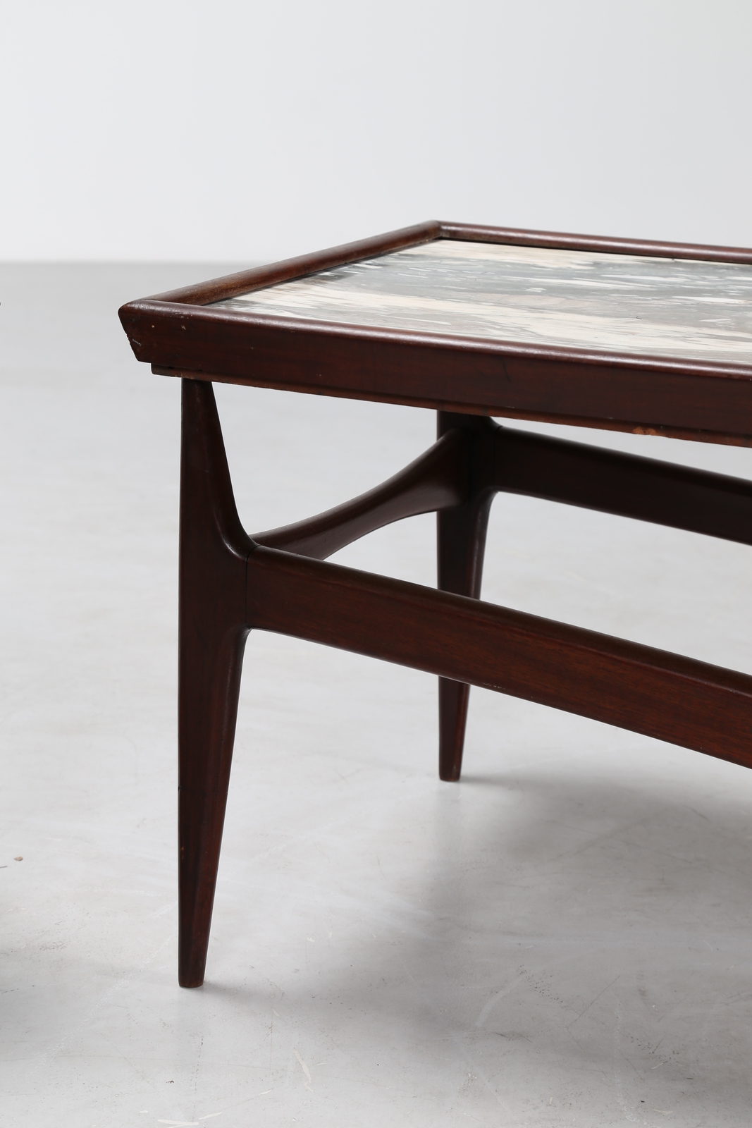 KAGAN VLADIMIR Attrib. Coppia di tavolini in legno con piano in marmo, anni 50. -. Cm 100,00 x 44,00 x 49,00. Misure: tavolino grande 44 x 100 x 49; tavolino piccolo 44 x 51,5 x 51,5