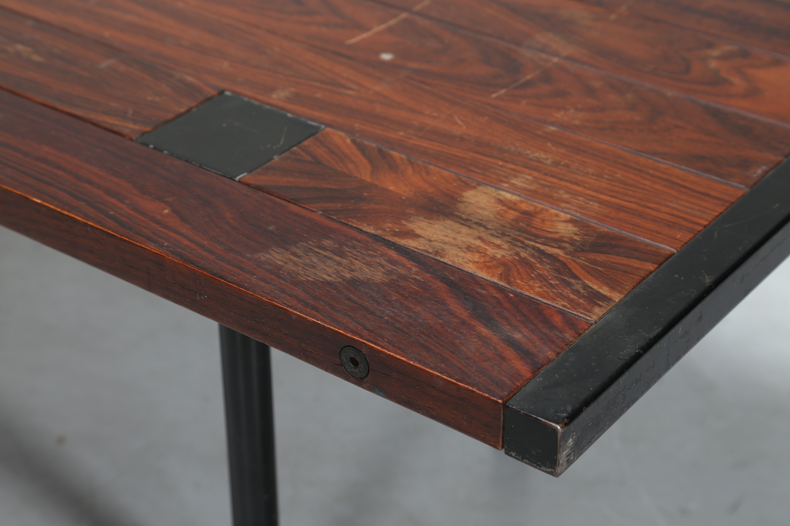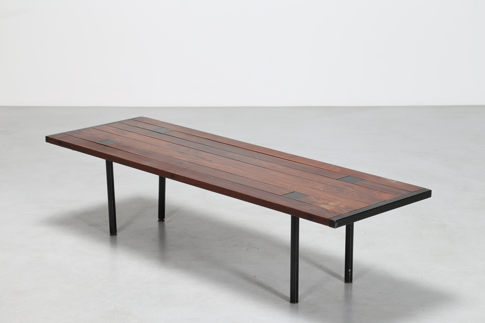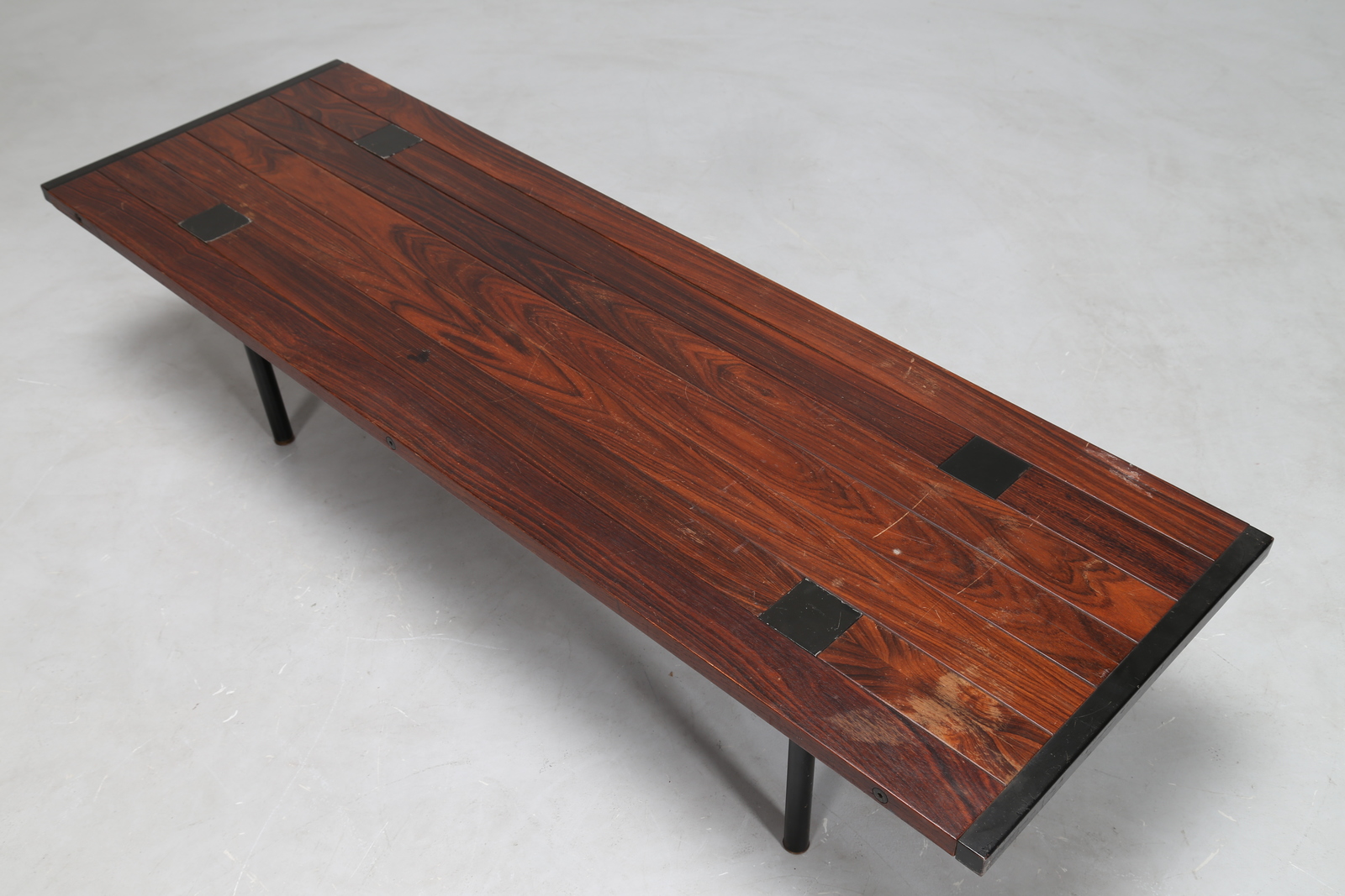 SOTTSASS ETTORE (1917 - 2007) Tavolino panchetto in palissandro con gambe in ferro verniciato, per Poltronova, anni 50. Pubblicazioni; Domus num. 353aprile 1959 pag.40/43 . -. Cm 152,50 x 37,00 x 49,00.
