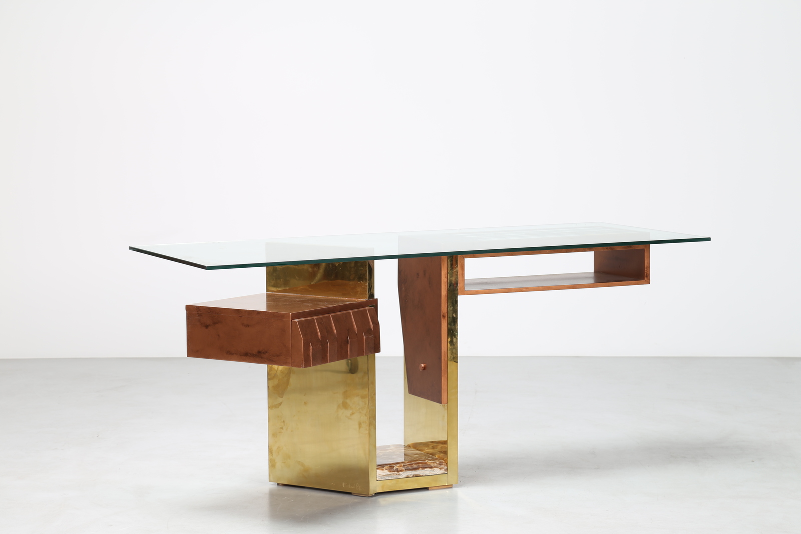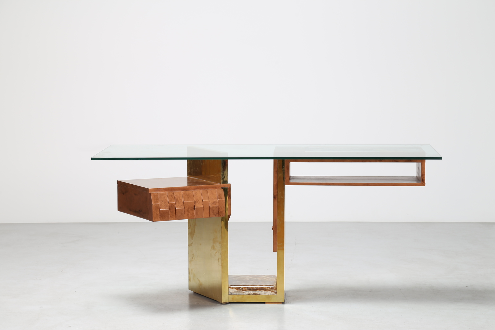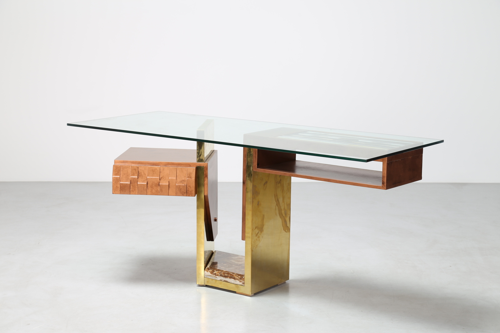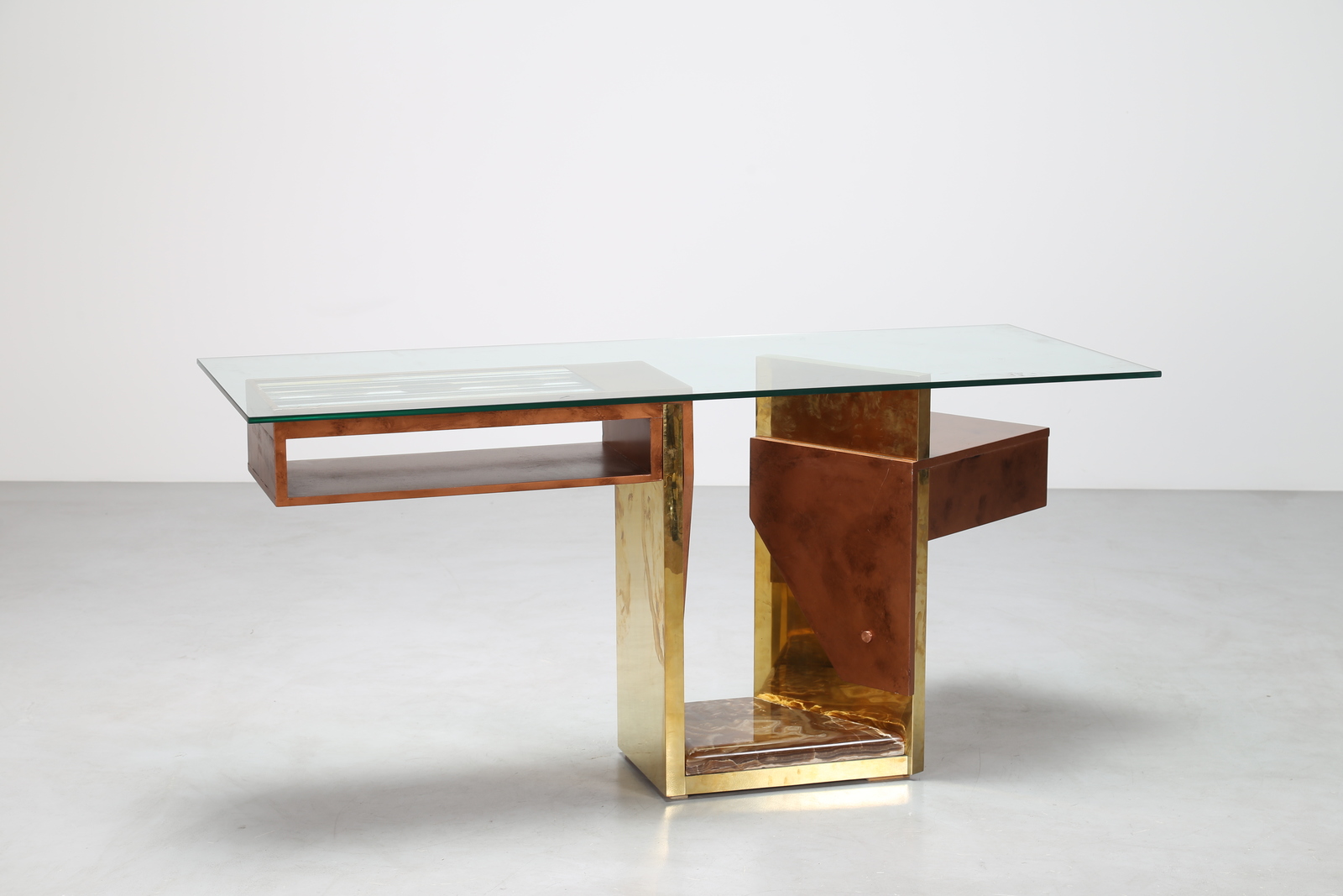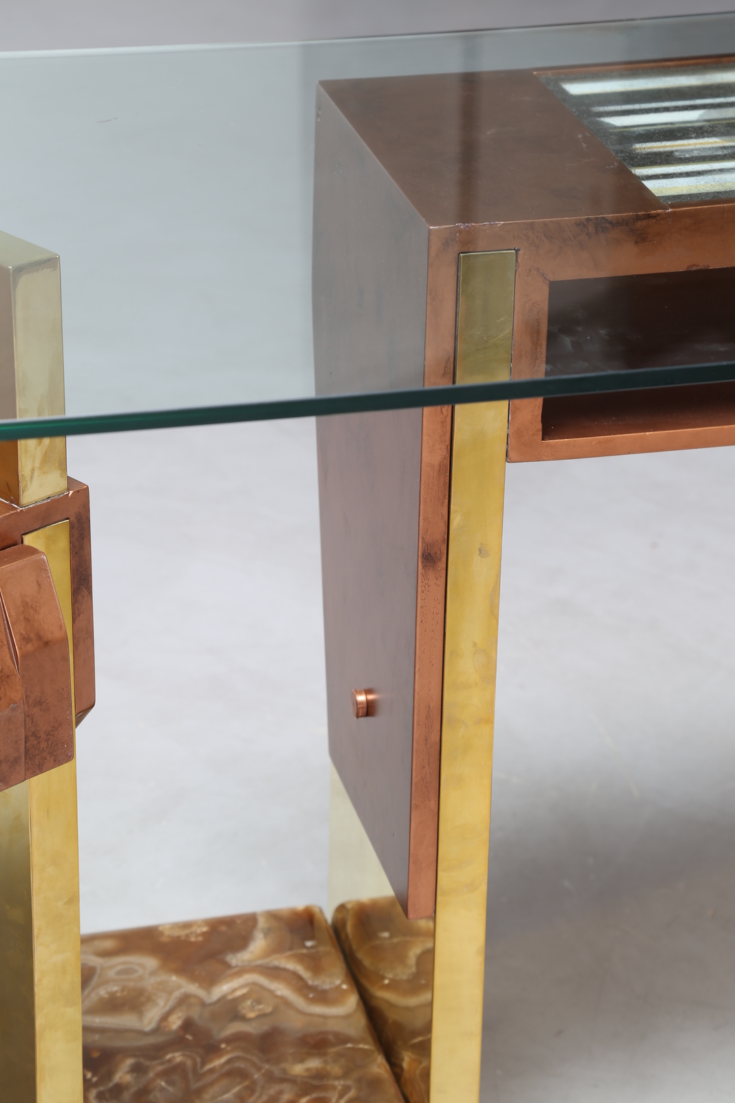 PILLANT MORDECAI Scrivania in legno ramato ottone piano in cristallo e base in onice, mod. Predicat uno di due. -. Cm 170,00 x 78,00 x 68,00.