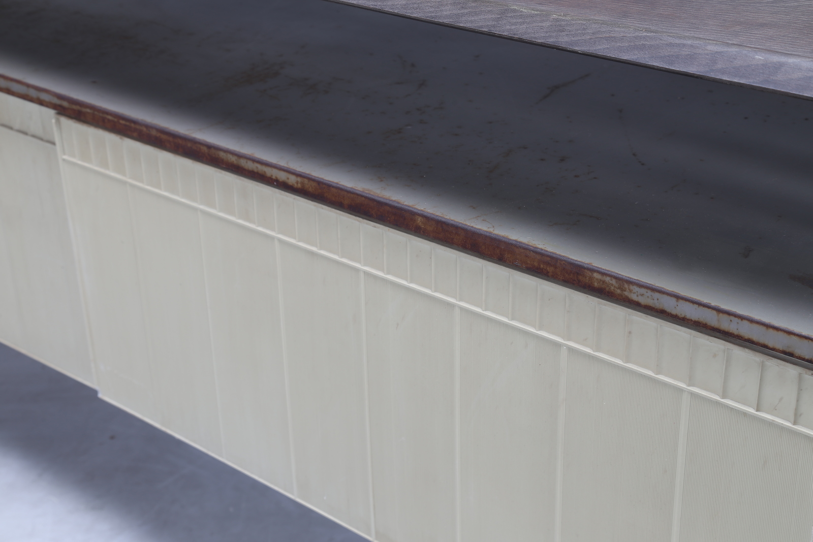 STUDIO BBPR (BANFI, BELGIOIOSO, PERESSUTTI, ROGERS) Credenza da ufficio in metallo plastica e piano in formica, per Olivetti Arredamenti Metallici, anni 60. -. Cm 180,00 x 79,00 x 42,00.